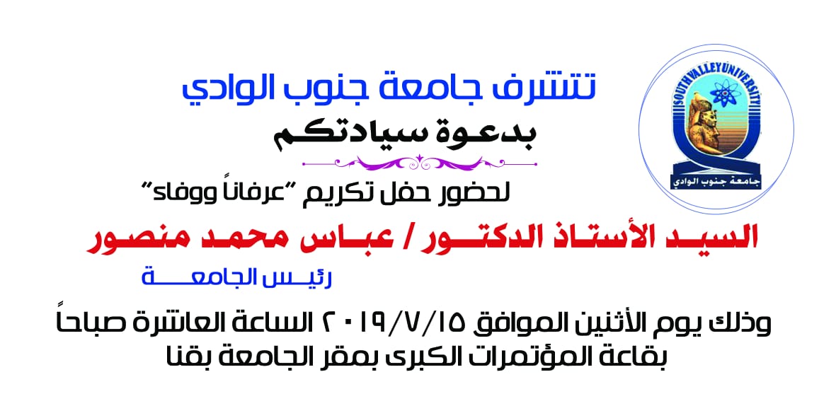 تتشرف جامعة جنوب الوادى بدعوة سيادتكم لحضور حفل تكريم عرفاناً ووفاءً للسيد الاستاذ الدكتور…المزيد
