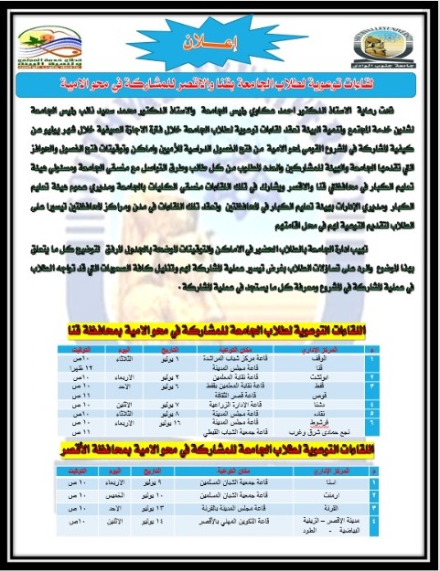Read Moreتعلن جامعة جنوب الوادي عن بدء التقدم للالتحاق بالاسكان الطلابي الفندقي المتميز للطلاب والطالبات…المزيد