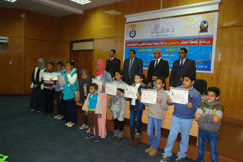 قام الدكتور عباس منصور رئيس جامعة جنوب الوادى بتكريم الأطفال المشاركين في المرحلة الثانية لبرنامج جامعة الطفل وذلك خلال حفل ختام التدريب الشتوى لجامعة الطفل ، وأكد الدكتور عباس منصور على سعادته بجامعة الطفل كمشروع يساهم في تشكيل الجوانب الإبداعية للأطفال مقدماً شكره لأولياء أمور الطلاب الذين أتاحوا الفرصة لأطفالهم بإخراج طاقاتهم الإبداعية في هذا المشروع وأضاف أن الجامعة لن تدخر جهداً في مساعدة هؤلاء الأطفال المبدعين والذين هم قادة المستقبل في الوطن مؤكداً إهتمام الدولة بالطفل وتنمية إبداعه في جميع الميادين ، وأشار الدكتور حفنى إسماعيل نائب رئيس الجامعة لشئون التعليم والطلاب أن من أهم الأسباب التي ستؤدى إلى إنجاح هذا المشروع هو تعاون أولياء الأمور بالمتابعة المستمرة مع الأطفال على ما يتلقونه وهو ما يتأتى بالتربية الثقافية والإبداعية . وأشار الدكتور محمود سيد عبد الصادق مسئول جامعة الطفل بجامعة جنوب الوادي أن الدراسة بدأت للمرحلة الثانية في البرنامج يوم 6/11/2015 م ، للفئات العمرية من 10 – 11 عام ومن 13 إلى 14 عام مضيفاً أن هذا البرنامج يتم تنفيذه في 26 جامعة بالتعاون مع أكاديمية البحث العلمي ، ويتضمن البرنامج تدريبات في مجالات الطاقة والمياه والبيولوجي والفنون وعلم المصريات والصحة والإنسانيات والوعى السياحى ، مشيراً إلى أنه سيتم الإعلان قريباً عن المرحلة الثالثة للبرنامج والفئات العمرية التي سيتعامل معها . الجدير بالذكر أن رئيس الجامعة تفقد قبل حفل الختام المعرض الفني للأطفال المشاركين ببرنامج جامعة الطفل والذى استخدم فيه الأطفال الخامات المستهلكة في انتاج قصص فنية ولوحات تعليمية مختلفة ومتنوعة وقام الأطفال بشرح أعمالهم الفنية ولوحاتهم لرئيس الجامعة والذى أشاد بهذه الأعمال الإبداعية للأطفال في هذه المرحلة العمرية .
