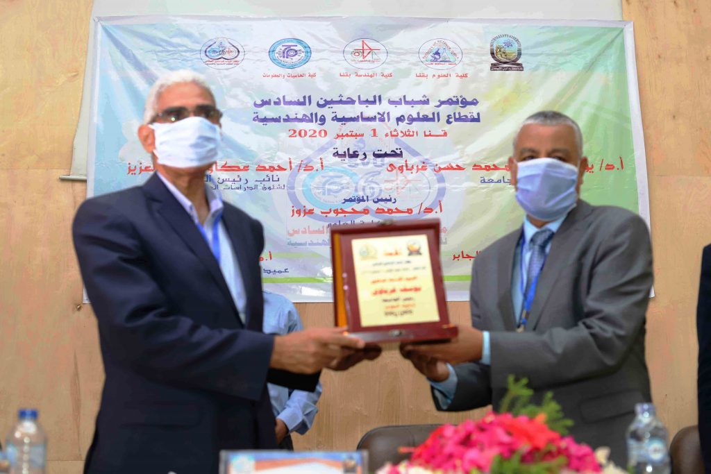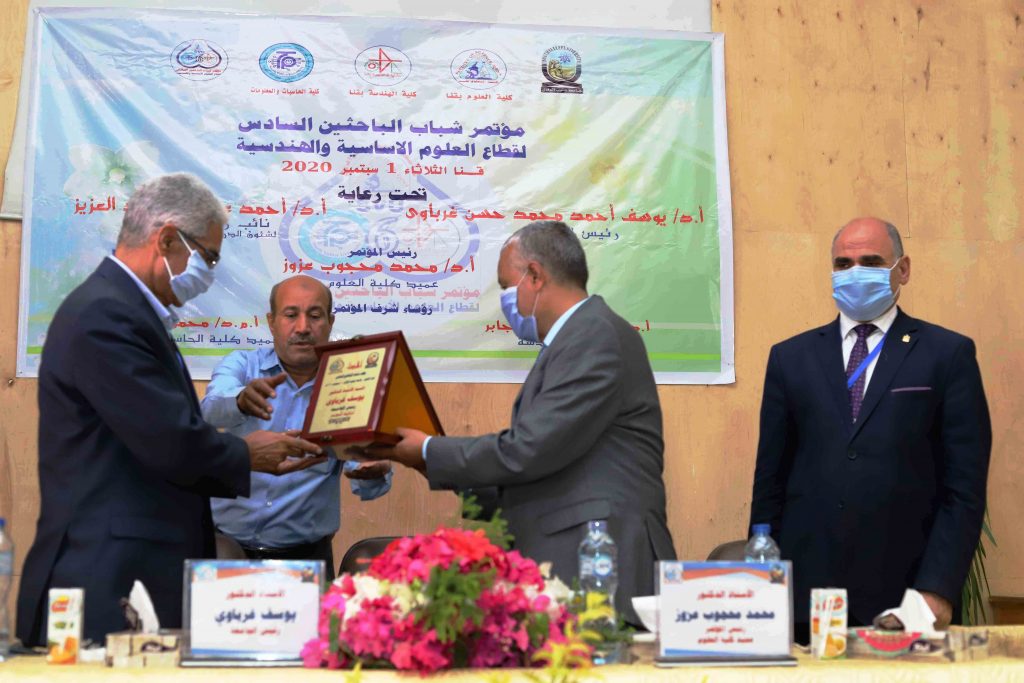واهدى الدكتور محمد محجوب عزوز عميد كلية العلوم ورئيس المؤتمر درع المؤتمر للدكتور يوسف غرباوي رئيس الجامعة ، والدكتور أحمد عكاوي نائب رئيس الجامعة لشئون الدراسات العليا والبحوث