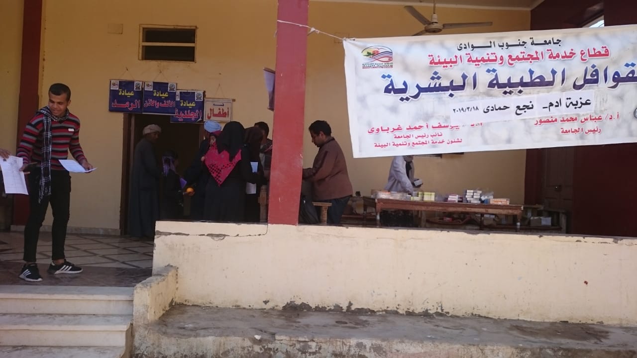 في اطار القوافل المتنوعة التي ينظمها قطاع شئون خدمة المجتمع وتنمية البيئة بجامعة جنوب الوادي تحت رعاية الدكتور عباس منصور رئيس الجامعة واشراف الدكتور يوسف الغرباوي نائب رئيس الجامعة لشئون خدمة المجتمع وتنمية البيئة نظمت الجامعة قافلة طبية بقرية عزبة أدم مركز نجع حمادى وصرح الدكتور يوسف الغرباوي نائب رئيس الجامعة لشئون خدمة المجتمع وتنمية البيئة انه شارك فى القافلة اطباء من كليتى الطب والصيدلة وانه تم الكشف وتقديم العلاج المجاني لعدد 261 حالة في التخصصات التالية الباطنة 40 حالة والرمد 100 حالة والعظام 60 حالة و الانف والاذن 20 حالة والاطفال20حالة والجلدية 21حالة