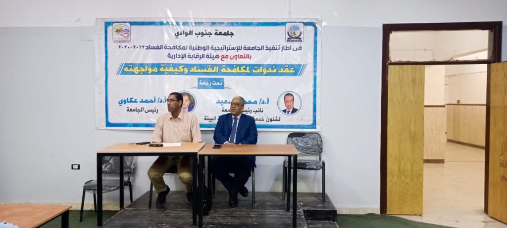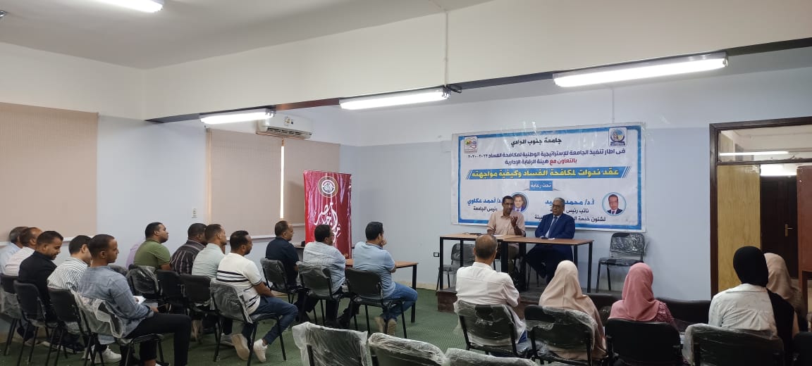 تحت رعاية الدكتور أحمد عكاوي، رئيس جامعة جنوب الوادي، والدكتور محمد سعيد، نائب رئيس الجامعة لشئون خدمة المجتمع وتنمية البيئة، نظمت كلية الزراعة بإشراف الدكتور عبد العزيز شيبة عميد الكلية ، وحضور الدكتور رأفت شيبت الحمد وكيل الكلية لشئون التعليم والطلاب ، والدكتور عبد الحليم احمد حمدي وكيل الكلية لشئون الدراسات العليا ندوة حول مكافحة الفساد