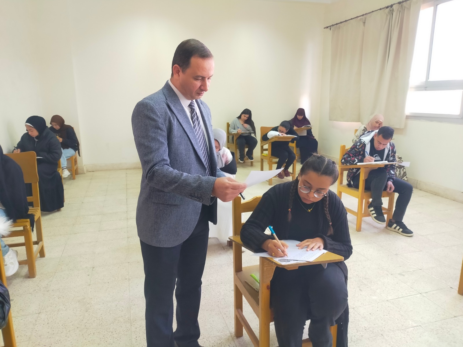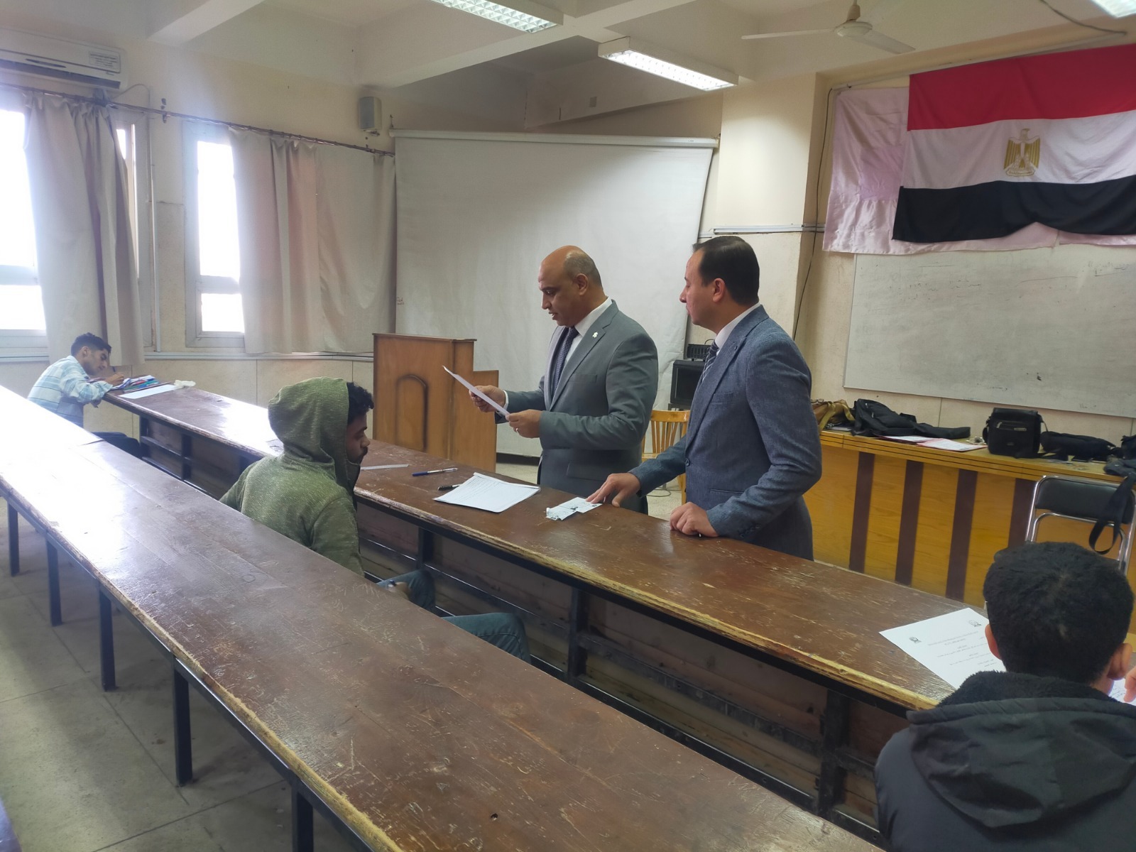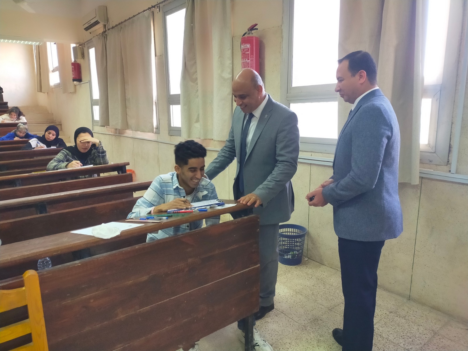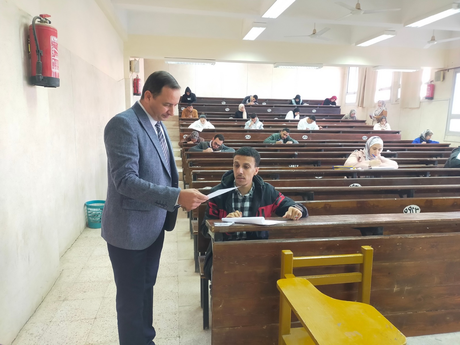 برعاية معالي أ. د. أحمد عكاوي رئيس الجامعة ومعالي أ. د. أشرف موسى نائب رئيس الجامعة لشئون التعليم والطلاب وأ.د.عصام حشمت محمد عميد الكلية وفي إطار المتابعة المستمرة لأعمال الامتحانات بالكلية قام أ. د. أشرف موسى نائب رئيس الجامعة لشئون التعليم والطلاب يرافقه عميد الكلية بتفقد لجان الامتحانات للفرق المختلفة بالكلية للإطمئنان على انضباط اللجان وسير أعمال الامتحانات بشكل منتظم.