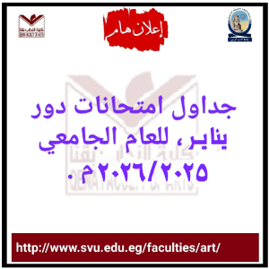 جداول امتحانات دور يناير للعام الجامعي 2026/2025 م Posted on ديسمبر 11, 2025ديسمبر 11, 2025 لتحميل جداول الساعات المعتمدة اضغط هنا لتحميل جداول البرامج المميزة اضغط هنا لتحميل جداول السنوات الدراسية واللائحة القديمة هنا