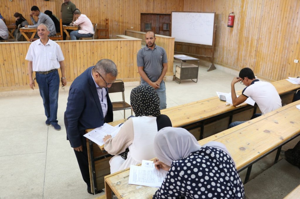 و تابع رئيس الجامعة التزام الطلاب بإتباع الاجراءات الاحترازية و التباعد و تواجد اساتذة المادة للرد على اي استفسارات و توفير كافة سبل الراحة للطلاب في اللجان و توفير التهوية اللازمة و المراوح نظرا لارتفاع درجة الحرارة و تواجد اللجان الطبية للتعامل مع اي حالات مرضية.