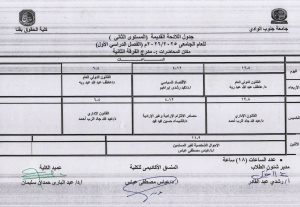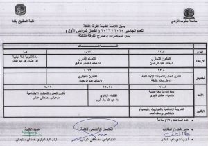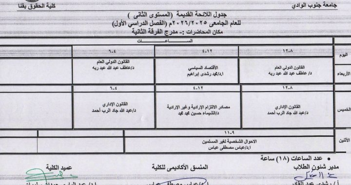 جداول محاضرات الفرقة الثانية – الفرقة الثالثة المستوى الثانى – المستوى الثالث (اللائحة القديمة ) الفصل الدراسي الأول للعام الجامعى 2025 / 2026م Posted on أكتوبر 17, 2025أكتوبر 19, 2025
