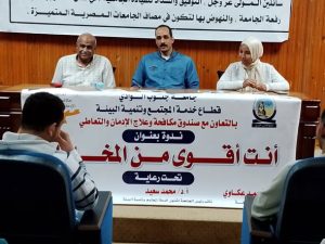 تحت رعاية الدكتور أحمد عكاوي رئيس الجامعة ، والدكتور محمد سعيد عبد الله نائب رئيس الجامعة لشئون خدمة المجتمع وتنمية البيئة تواصلت ندوات التوعية بمكافحة الإدمان والتعاطي التي ينظمها قطاع خدمة المجتمع وتنمية البيئة بجامعة قنا بالتعاون مع صندوق مكافحة الإدمان والتعاطي