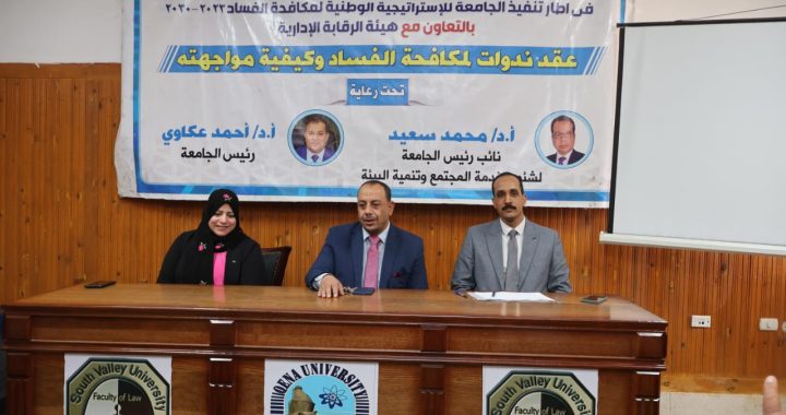 تحت رعاية الدكتور أحمد عكاوي رئيس جامعة قنا والدكتور محمد سعيد نائب رئيس الجامعة لشئون خدمة المجتمع وتنمية البيئة نظمت كلية الحقوق بالجامعة ندوة توعوية عن مكافحة الفساد بحضور الدكتور عبد الباري حمدان سليمان عميد الكلية والدكتور عباس مصطفي عباس وكيل الكلية لشئون التعليم والطلاب والاستاذ عبدالرازق فرغلي امين الكلية حاضر فيها الدكتورة بدرية حسن علي وكيل كلية التربية النوعية لشئون خدمة المجتمع وتنمية البيئة