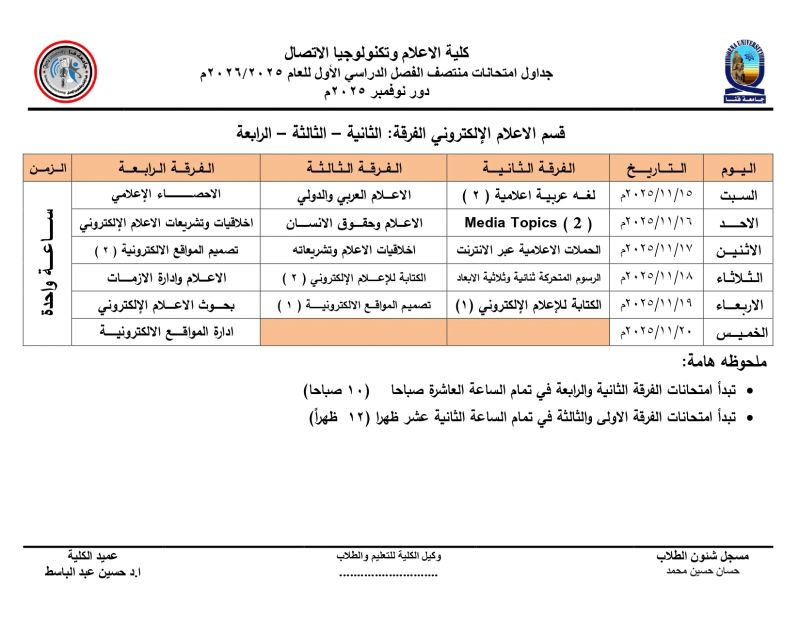 Read Moreجداول امتحانات منتصف الفصل الدراسى الأول نوفمبر 2025-2026م بكلية الاعلام وتكنولوجيا الاتصال جامعة قنا