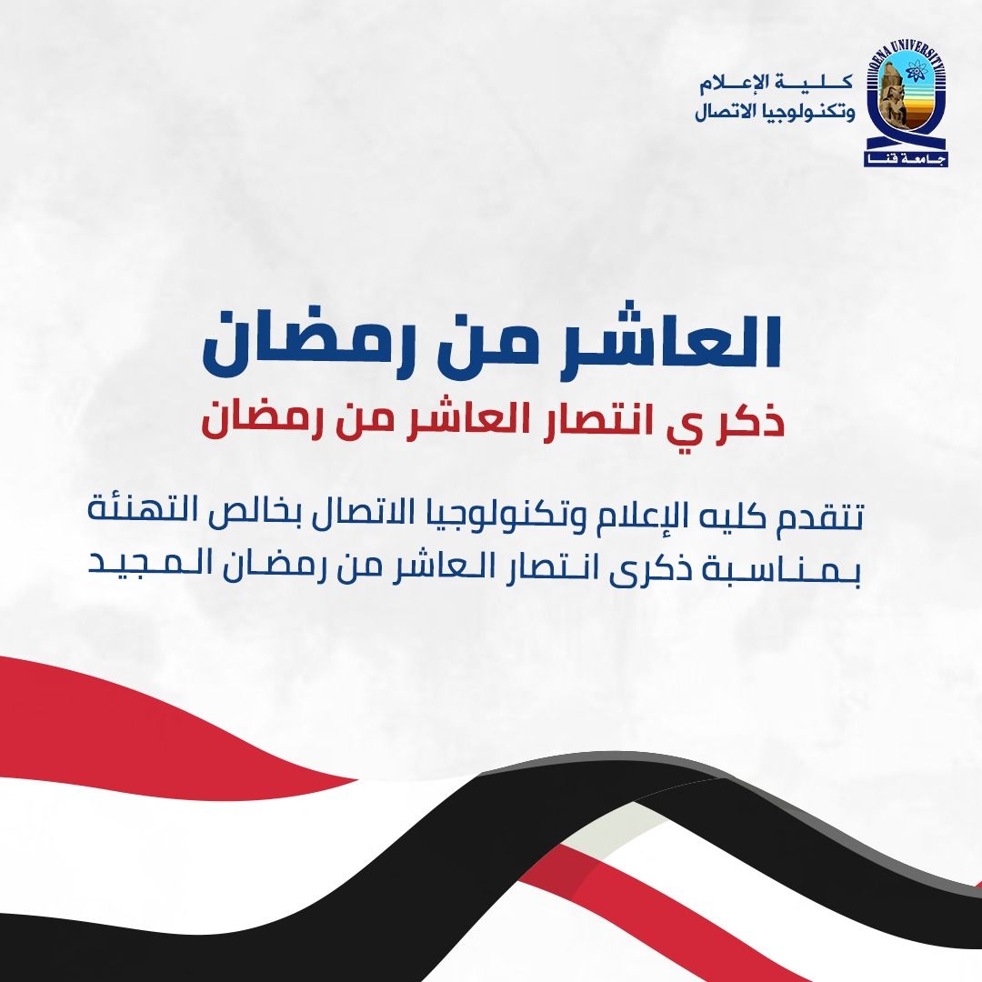 كلية الإعلام جامعة قنا تهنئ القيادة السياسية ورجال القوات المسلحة وجموع الشعب المصري بمناسبة ذكرى انتصار العاشر من رمضان المجيدة،