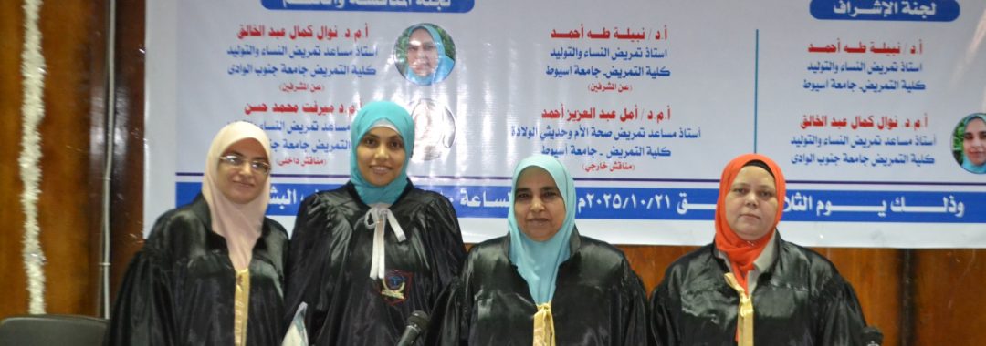 تحت رعاية الاستاذ الدكتور/ احمد عكاوي رئيس الجامعة الاستاذ الدكتور / محمد وائل نائب رئيس الجامعة و الاستاذ الدكتور / شمردن عزالدين عميد الكلية. و الاستاذ الدكتور / ايمان محمد أحمد الشاذلى وكيل الكلية للدراسات العليا تمت مناقشة رسالة ماجستير بقسم تمريض النساء و التوليد كلية التمريض جامعة جنوب الوادى و المقدمة من الباحثة خديجة بكر و ذلك يوم الثلاثاء الموافق ٢١ / ١٠ / ٢٠٢٥