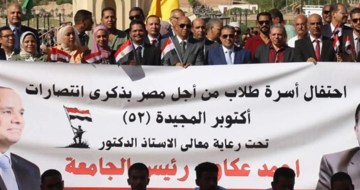 نظمت جامعة جنوب الوادى احتفالية كبرى بمناسبة الذكرى الثانية والخمسين لانتصارات أكتوبر المجيدة ، وذلك تحت رعاية الدكتور أحمد عكاوى رئيس الجامعة وبحضور لفيف من عمداء ووكلاء الكليات وأعضاء هيئة التدريس والقيادات الإدارية والعاملين وطلاب الجامعة من مختلف الكليات، وطلاب الجامعة الأهليى