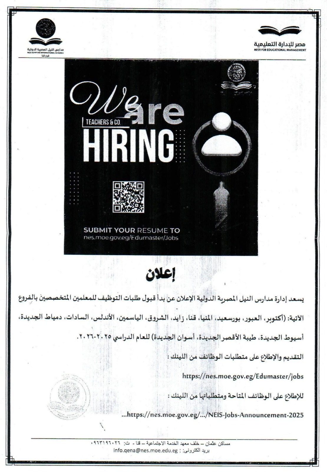 يسعد إدارة مدارس النيل المصرية الدولية للإعلان عن بدء قبول طلبات التوظيف للمعلمين المتخصصين…المزيد