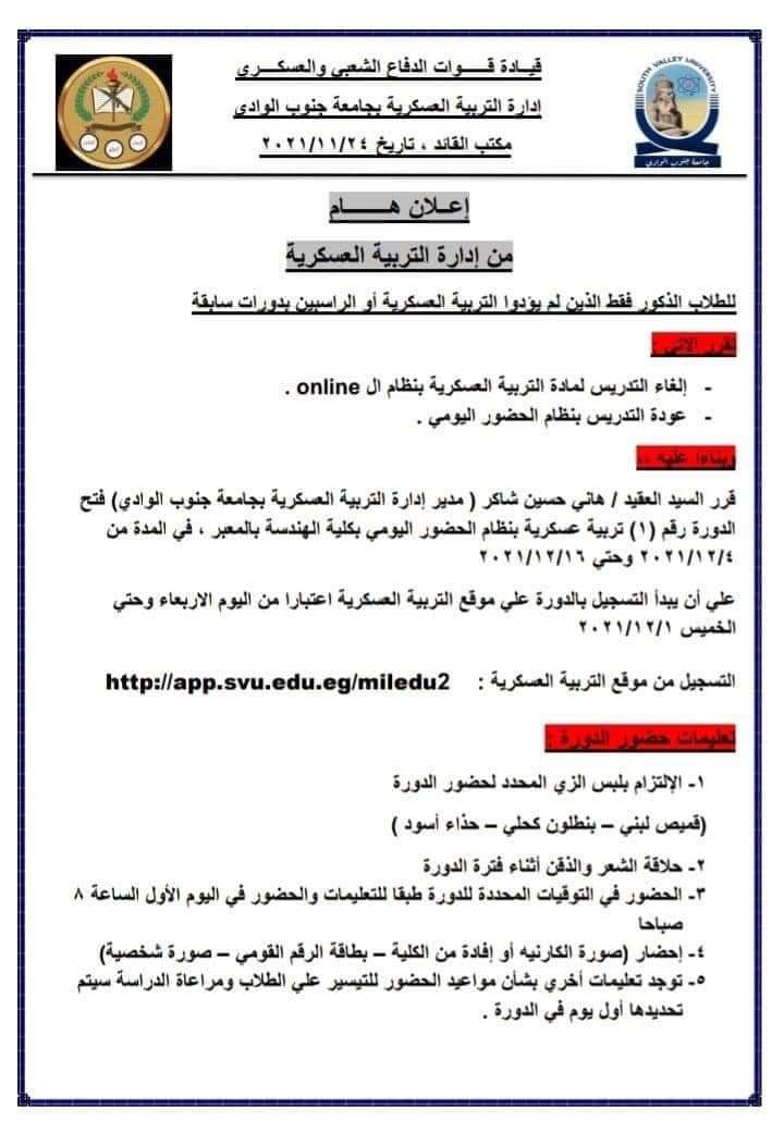 قرر السيد العقيد / هاني حسين شاكر ( مدير إدارة التربية العسكرية بجامعة جنوب الوادي) فتح الدورة رقم (1) تربية عسكرية بنظام الحضور اليومي بكلية الهندسة بالمعبر ، في المدة من 4/12/2021 وحتي 16/12/2021