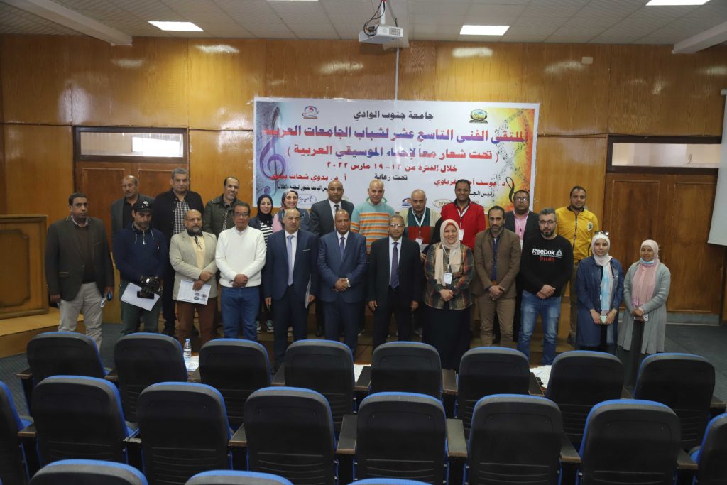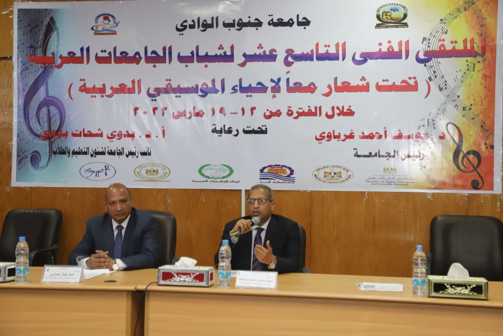 في اطار توجيهات الدكتور يوسف غرباوي رئيس جامعة جنوب الوادي بتوفير كافة سبل الراحة لوفود الجامعات المشاركة بالملتقى الفني التاسع عشر لشباب الجامعات الذي تنظمه الجامعة خلال الفترة من 13 الى 17 مارس الجاري اقيم اليوم بمقر الجامعة بقنا اجتماع برؤساء الوفود بحضور الدكتور بدوي شحات نائب رئيس الجامعة لشئون التعليم و الطلاب و الدكتور احمد كمال نصاري نائب رئيس الجامعة لشئون خدمة المجتمع وتنمية البيئة و الدكتور اشرف موسى عميد كلية التربية الرياضية رئيس اللجنة المنظمة للملتقى الفني و الدكتور محمد سعيد عميد كلية التربية النوعية مستشار النشاط الفني بالجامعة .