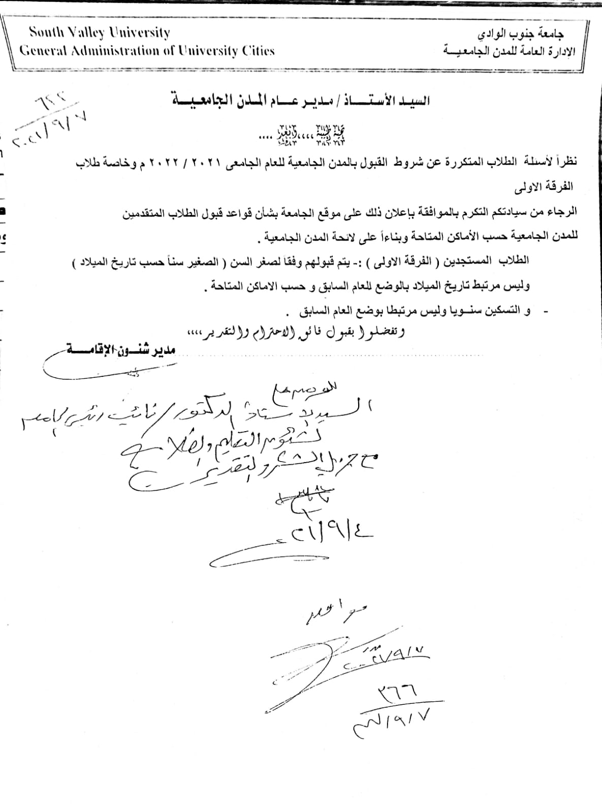 صرحت ادارة المدن الجامعية فيما يخص الطلاب الجدد للعام الدراسى القادم ان من يتم قبولهم بالمدن الجامعية هم الطلاب الاصغر سناً بالنسبة لطلاب الفرقة الاولى فى جميع الكليات.