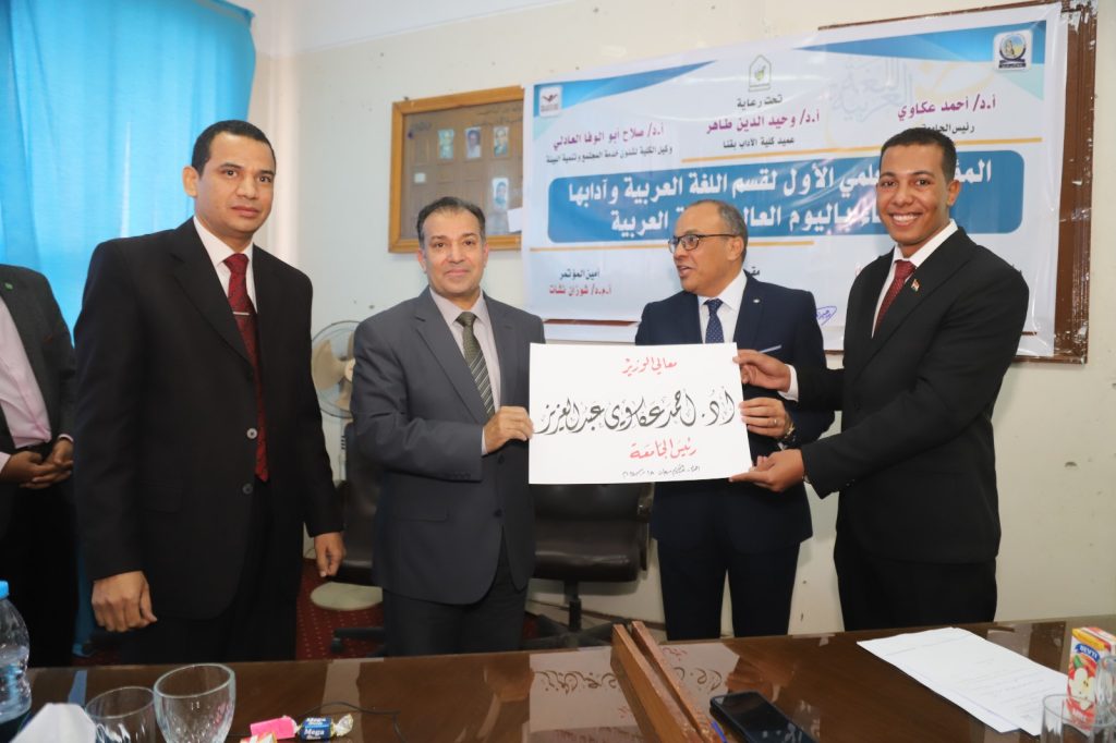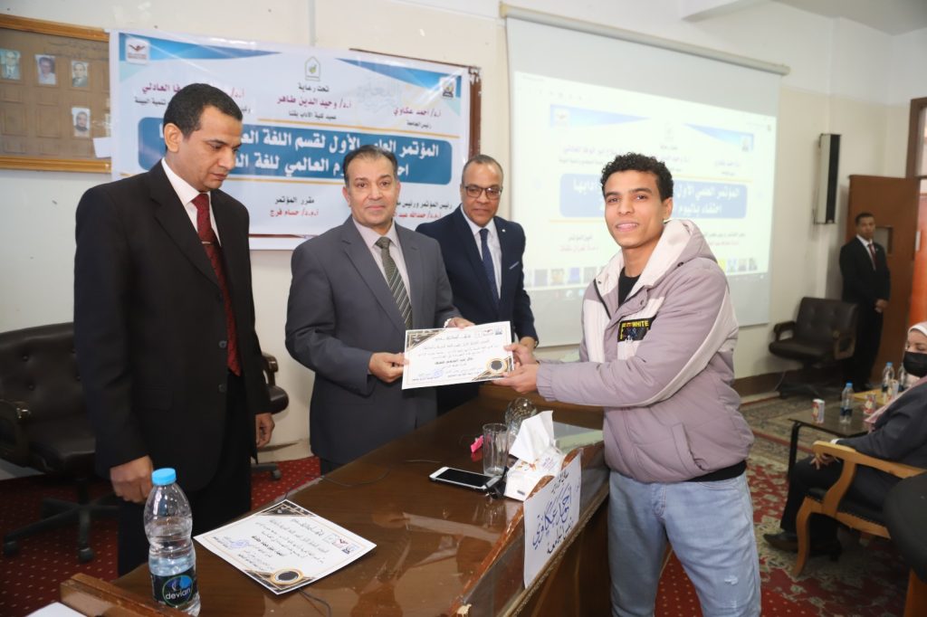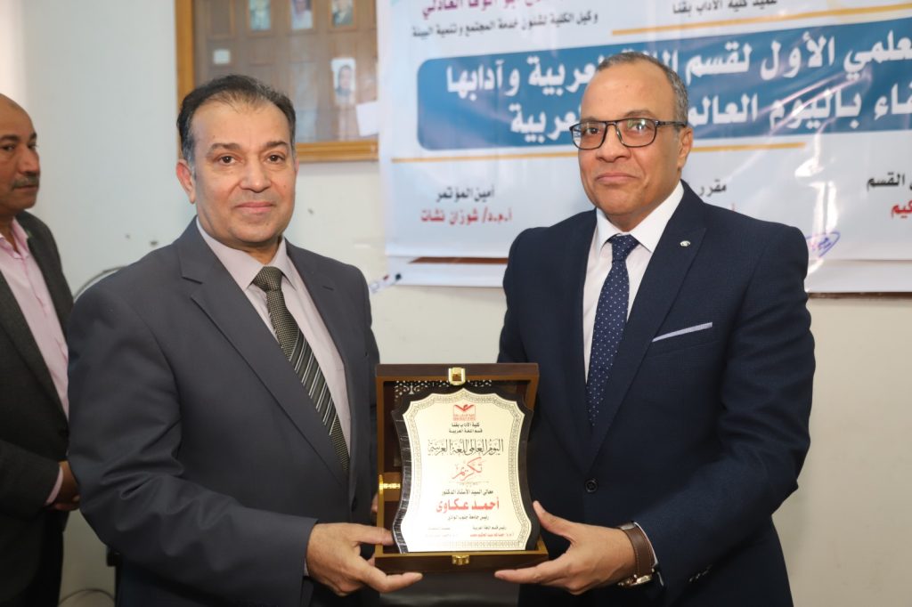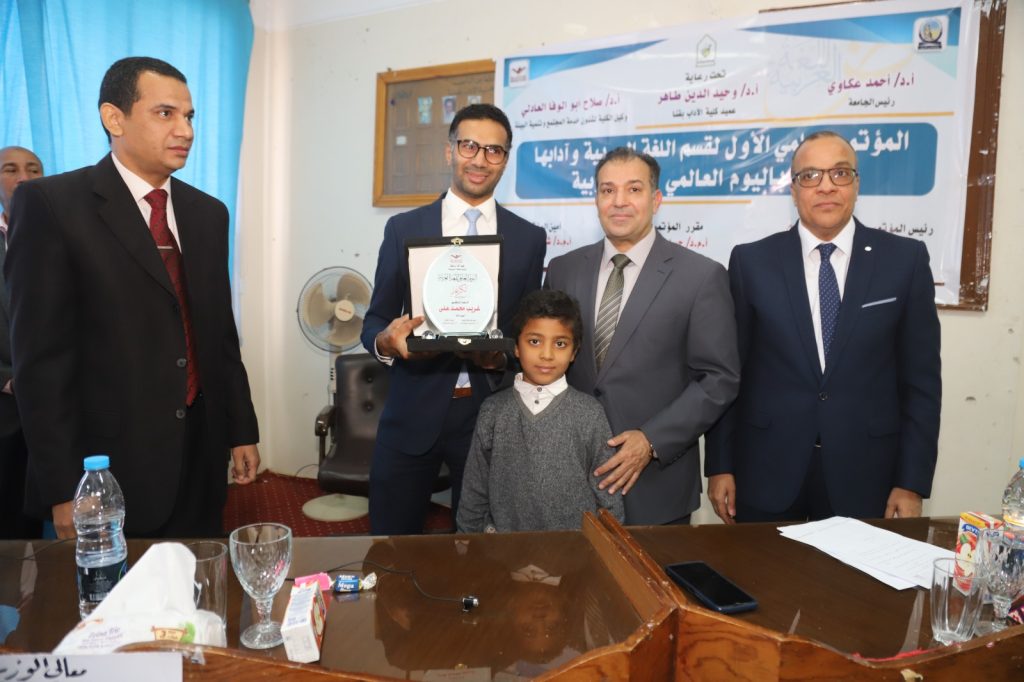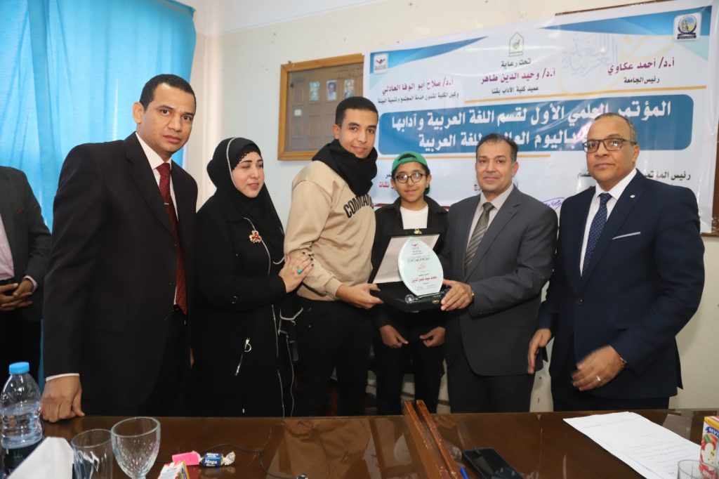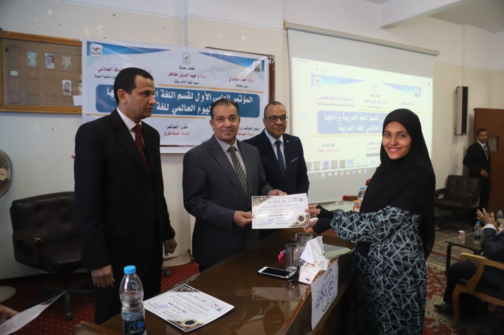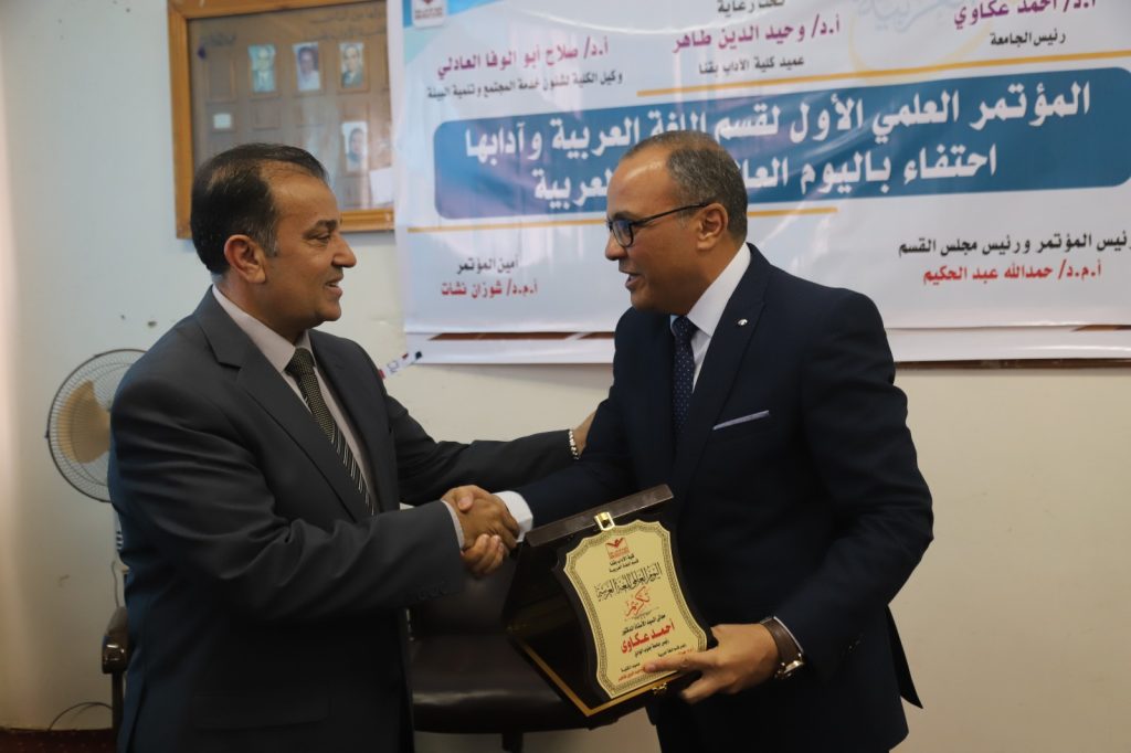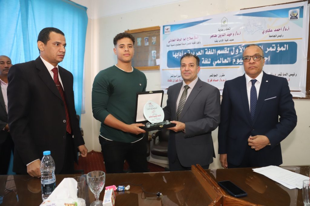 وقام الدكتور وحيد الدين طاهر بإهداء درع المؤتمر للدكتور أحمد عكاوي رئيس الجامعة تقديرا لجهوده كما تم تكريم رموز قسم اللغة العربية بكلية الآداب الذين كان لهم الفضل الكبير في خدمة اللغة العربية،