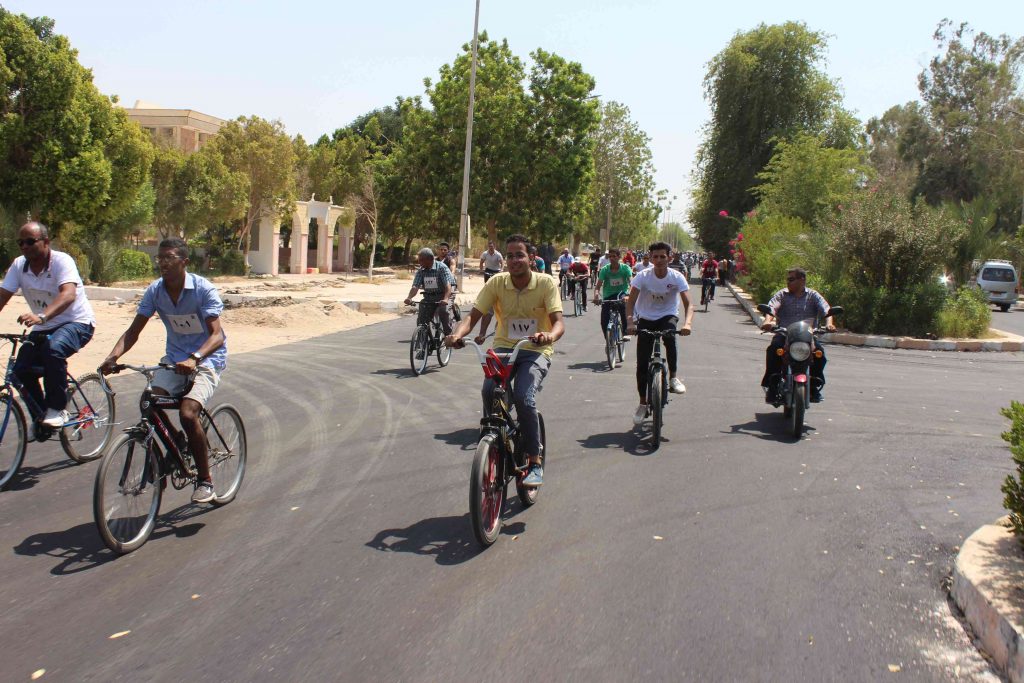 انطلقت منافسات ماراثون سباق الدراجات الهوائية بجامعة جنوب الوادى تحت رعاية الدكتور يوسف غرباوي رئيس جامعة جنوب الوادى والذى نظمته الجامعة بمشاركة طلاب الجامعة وأعضاء هيئة التدريس والعاملين وبحضور الدكتور عباس منصور رئيس الجامعة السابق وذلك تشجيعاً لاستخدام الدراجات كوسيلة للتنقل داخل وخارج الجامعة وتماشياً مع خطة وزارة التعليم العالي وأكد الدكتور يوسف غرباوى رئيس الجامعة بأن الهدف من تنظيم سباق الدراجات الهوائية هو تشجيع طلاب الجامعة على ممارسة الرياضة والتى تعمل على رفع اللياقة البدنية لدى الطلاب وحرصاً من ادارة الجامعة على تنوع الانشطة الطلابية على مدار العام الدراسي ودعا رئيس الجامعة الطلاب الى المشاركة فى كافة الانشطة الطلابية والتى تنظمها الجامعة على مدار العام الدراسي واشار الدكتور محمد ابو الفضل بدران نائب رئيس الجامعة لشئون التعليم والطلاب ان السباق اشترك فيه 150 طالب وطالبة وبدأ من امام قاعة المؤتمرات بالجامعة وانتهى بالصالة المغطاة بالقرية الاوليمبية حيث احتل الطالب بلال مصطفى محمود من كلية التربية المركز الاول وجاء الطالب محمود خالد فهيم من كلية التربية الرياضية فى المركز الثاني بينما جاء الطالب كارم حجاج محمد من وزارة التربية والتعليم فى المركز الثالث وعلى مستوى الطالبات احتلت الطالبة ابتسام ابراهيم احمد من كلية التربية الرياضية المركز الاول والطالبة مروج محمد ابو الحسن من كلية التربية الرياضية فى المركز الثاني بينما جاءت الطالبة اميرة حسين على من كلية التربية فى المركز الثالث وجدير بالذكر ان السباق شارك فيه الدكتور يوسف غرباوى رئيس الجامعة والدكتور عباس منصور رئيس الجامعة السابق والدكتور محمد ابو الفضل بدران نائب رئيس الجامعة وعمداء الكليات واعضاء هيئة التدريس بالجامعة وفى نهاية السباق قام الدكتور يوسف غرباوى رئيس الجامعة والدكتور عباس منصور رئيس الجامعة السابق والدكتور احمد كمال نصارى عميد كلية التربية الرياضية والدكتور على الدين القصبي منسق عام الانشطة الطلابية بتوزيع الجوائز على الطلاب الحاصلين على المراكز الاولى