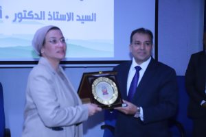 وفى نهاية الجلسة الحوارية قدم الدكتور خالد عبد الحليم محافظ قنا درع المحافظة لوزيرة البيئة ، كما قام الدكتور احمد عكاوي رئيس الجامعة بتقديم درع الجامعة لوزيرة البيئة تكريما وتقديرا لسيادتها.