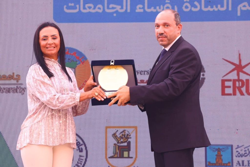 واناب الدكتور أحمد عكاوي رئيس الجامعة الدكتور محمد وائل عبدالعظيم نائب رئيس الجامعة لشئون الدراسات العليا والبحوث ممثلا عن الجامعة بحضور الدكتور محمد العقبي، مساعد وزيرة التضامن الاجتماعي والمشرف العام على مشروع وحدات التضامن الاجتماعي، حيث سلّمت وزيرة التضامن الاجتماعي درع التكريم للدكتور محمد وائل عبدالعظيم، نائب رئيس الجامعة لشئون الدراسات العليا والبحوث