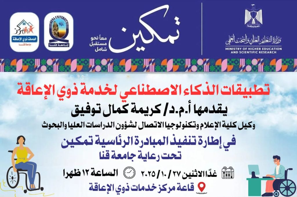 حيث أقيمت محاضرة علمية رصينة عن تطبيقات الذكاء الاصطناعي لخدمة ذوي الاعاقة بمركز خدمات ذوي الاعاقة قدمتها الدكتورة كريمة كمال وكيل كلية الإعلام وتكنولوجيا الاتصال لشؤون الدراسات العليا والبحوث ، وبحضور الدكتور حسين ابو المجد مدير مركز خدمات ذوى الاعاقة بجامعة قنا.
