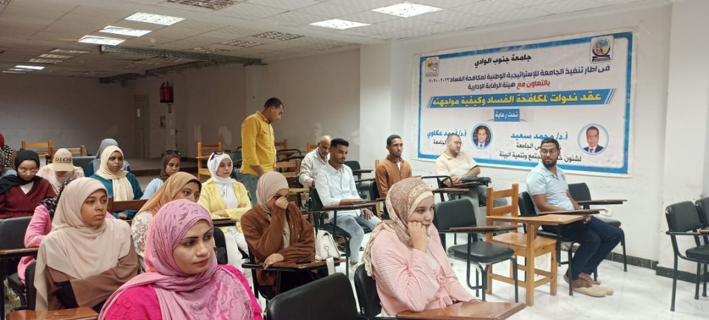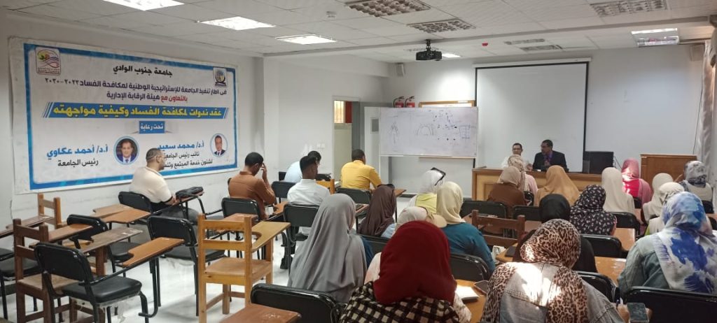 تحت رعاية الدكتور أحمد عكاوي رئيس جامعة قنا والدكتور محمد سعيد نائب رئيس الجامعة لشئون خدمة البيئة وتنمية المجتمع واصلت جامعة قنا عمل ندوات مكافحة الفساد بكلياتها حيث اقيمت ندوة عن مكافحة الفساد بكلية طب الفم والاسنان بحضور الدكتور احمد طلعت تميرك عميد الكلية والدكتور الطيب عبد الرازق محمد وكيل الكلية لشئون خدمة المجتمع وتنمية البيئة حاضر الندوة الدكتور صلاح ابو الوفا وكيل كلية الآداب لشئون خدمة المجتمع وتنمية البيئة