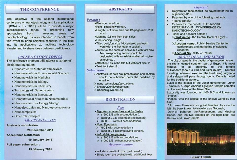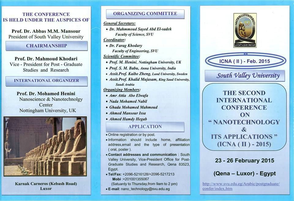 أكد الدكتور محمود خضاري نائب رئيس الجامعة للدراسات العليا والبحوث أن الجامعة بصدد الإعداد للمؤتمر الدولي الثاني في علوم النانو وتطبيقاته في الفترة من 23-26من شهر فبراير القادم تحت رعاية الدكتور عباس منصور رئيس الجامعة وأضاف أن المؤتمر سينعقد للمرة الثانية على التوالي بمحافظة الأقصر لمناقشة تطور علوم النانو وتطبيقاته في العديد من المجالات ومن جانبه قال الدكتور محمود سيد عبد الصادق سكرتير عام المؤتمر أن المؤتمر سيتشرف بحضور نخبة كبيرة من علماء النانو الأجانب من دول مختلفة وذلك لإثراء المؤتمر ومناقشاته وأبحاثه التي تكون دائما أحدث ما توصل إليه العلم في النانو .