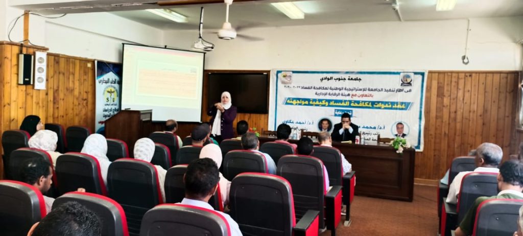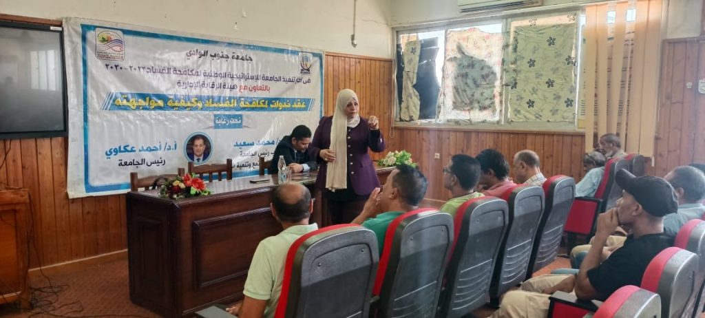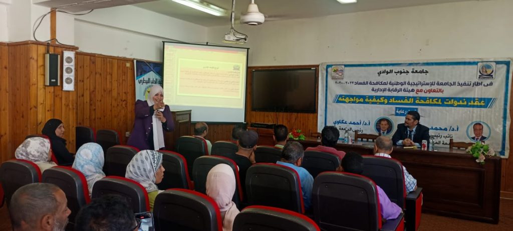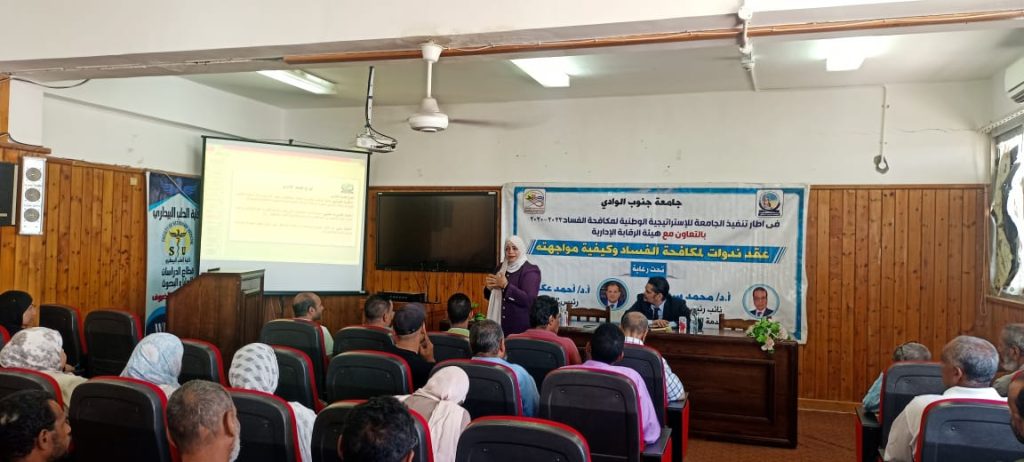 تحت رعاية الدكتور أحمد عكاوي رئيس جامعة جنوب الوادي والدكتور محمد سعيد نائب رئيس الجامعة لشئون خدمة المجتمع وتنمية البيئة نظمت كلية الطب البيطرى بالجامعة ندوة توعوية عن مكافحة الفساد تحت عنوان ” مكافحة الفساد واجب وطنى ” بحضور الدكتور سامي عبد الرؤوف فهيم عميد الكلية حاضر فيها الدكتورة بدرية حسن علي وكيل كلية التربية النوعية لشئون خدمة المجتمع وتنمية البيئة