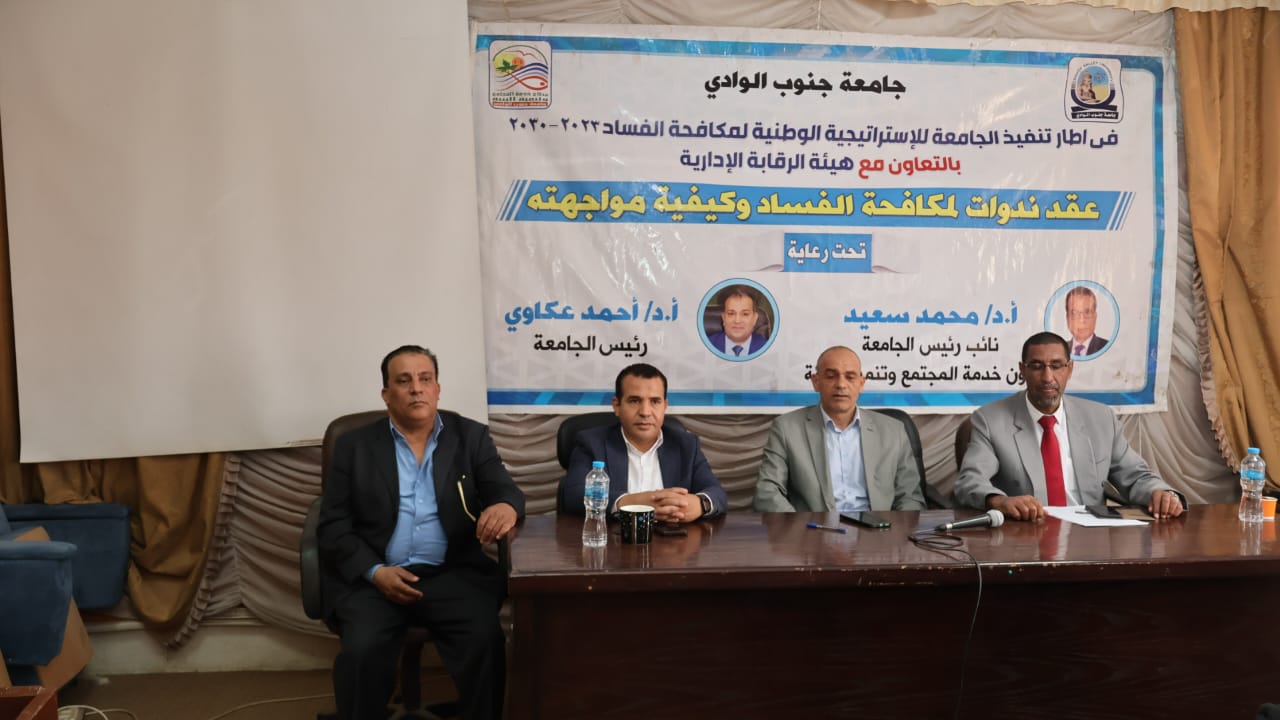 تحت رعاية الدكتور أحمد عكاوي رئيس جامعة قنا والدكتور محمد سعيد نائب رئيس الجامعة لشئون خدمة المجتمع وتنمية البيئة نظمت كلية التجارة بالجامعة ندوة توعوية بعنوان ” حكم الفساد في الشرع والدين ” بحضور الدكتور ابو الحمد مصطفي عميد الكلية والدكتور محمد عزام عبد المجيد وكيل الكلية لشئون خدمة المجتمع وتنمية البيئة حاضر فيها الدكتور صلاح ابو الوفا العادلي وكيل كلية الآداب لشئون خدمة المجتمع وتنمية البيئة
