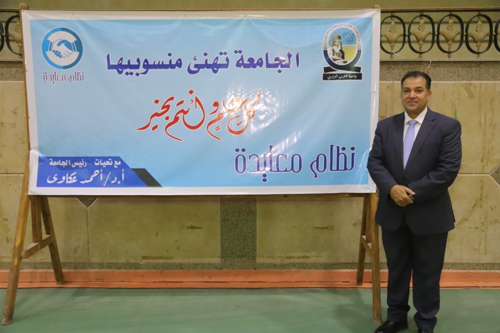 شهد الدكتور احمد عكاوي رئيس جامعة جنوب الوادي احتفالية معايدة عيد الأضحى المبارك والتي تأتى ضمن الانشطة الاجتماعية في اطار الخطة التطويرية للجامعة برئاسة الدكتور احمد عكاوي ، جاء ذلك بحضور الدكتور عباس منصور رئيس الجامعة الاسبق، والدكتور محمد سعيد نائب رئيس الجامعة لشئون خدمة المجتمع وتنميه البيئة، الدكتور محمد وائل عبد العظيم نائب رئيس الجامعة لشئون الدراسات العليا والبحوث، الدكتور محمود خضارى نائب رئيس الجامعة الأسبق، وعمداء ووكلاء مختلف كليات الجامعة، والدكتور جمال عطا الاستاذ المتفرغ بكلية العلوم والمشرف على فريق اللجنة التنفيذية للمبادرة ، وطروب طلبة امين الجامعة ، وعبد الرازق حسين امين الجامعة المساعد، واعضاء هيئة التدريس من مختلف كليات الجامعة، ولفيف من القيادات الادارية والجهاز الإداري بالجامعة.