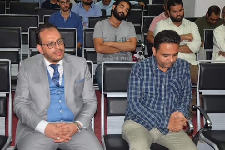 بحضور الدكتور على عبد الرحمن غويل عميد كلية الطب ووكلاء الكلية ورؤساء الاقسام والعديد من اساتذة الكلية وأهالي الباحث.