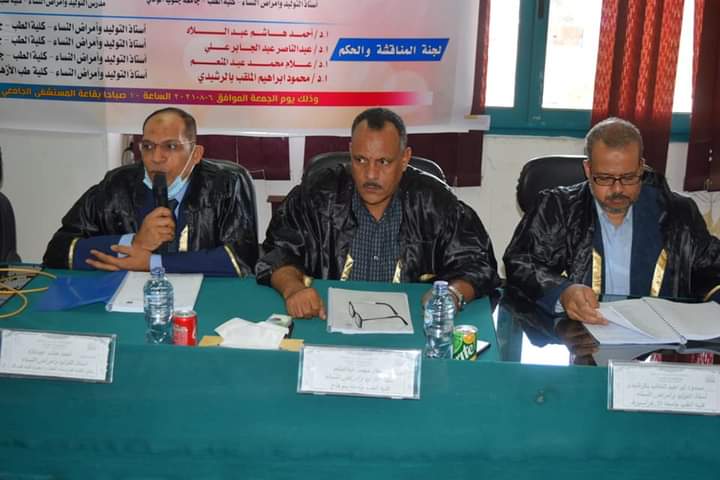 وتكونت لجنة الاشراف والحكم والمناقشة كلا من الدكتور احمد هاشم عبداللاه استاذ النساء والتوليد ووكيل كلية الطب بقنا والدكتور صباح احمد محمد فاضل استاذ الباثولوجى بطب اسيوط والدكتور عبدالناصر عبدالجابر على استاذ النساء والتوليد بطب قنا والدكتور علام محمد عبدالمنعم استاذ التوليد وأمراض النساء بطب سوهاج والدكتور محمود ابراهيم الملقب بالرشيدي استاذ التوليد وإمراض النساء بطب الازهر بنين بأسيوط والدكتور حازم هاشم احمد مدرس التوليد وامراض النساء.