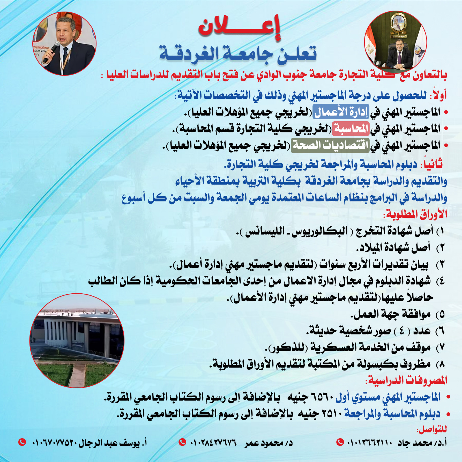 فتح باب التقدم للدراسات العليا بجامعة الغردقة بالتعاون مع تجارة جنوب الوادي