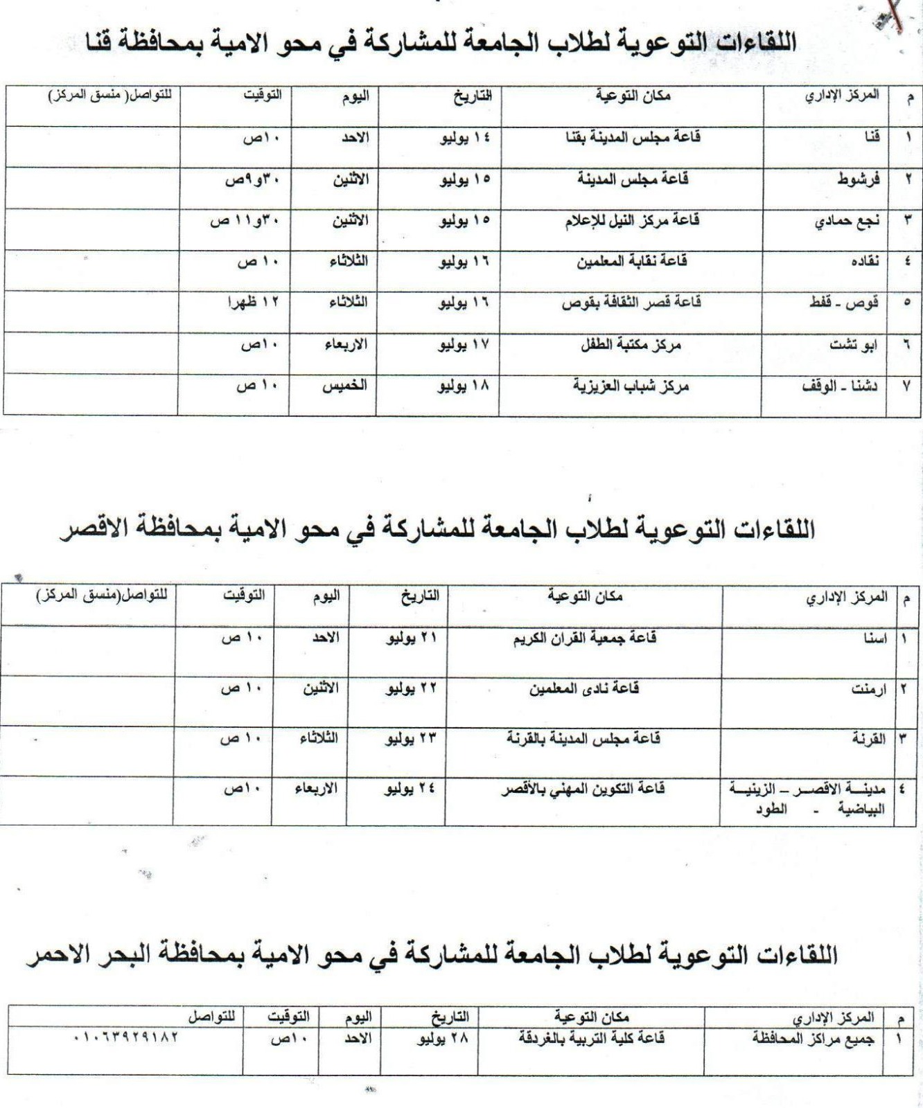 تحت رعاية الدكتور احمد عكاوي رئيس جامعة جنوب الوادى والدكتور محمد سعيد نائب رئيس الجامعة لشئون خدمة المجتمع وتنمية البيئة تعقد لقاءات توعوية لطلاب الجامعة خلال فترة الإجازة الصيفية عن كيفية المشاركة في المشروع القومي لمحو الأمية من فتح الفصول الدراسية للأميين واماكن وتوقيتات فتح الفصول والحوافز التي تقدمها الجامعة والهيئة للمشاركين والعدد المطلوب من كل طالب وطرق التواصل مع منسقي الجامعة ومسئولي هيئة تعليم الكبار في محافظات قنا والاقصر والبحر الاحمر ويشارك في تلك اللقاءات منسقي الكليات بالجامعة ومديري عموم هيئة تعليم الكبار ومديرى الادارات في المحافظات الثلاثة وتعقد تلك اللقاءات في مدن ومراكز المحافظات الثلاثة تيسيراً على الطلاب لتقديم التوعية لهم في محل اقامتهم