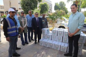 كما قام رئيس الجامعة فى إشادة منه بالعمل التطوعي والتأكيد على أهميته بمشاركة متطوعي المؤسسة فى توزيع بعض صناديق المواد الغذائية على بعض أفراد الامن بإدارة الأمن الجامعى