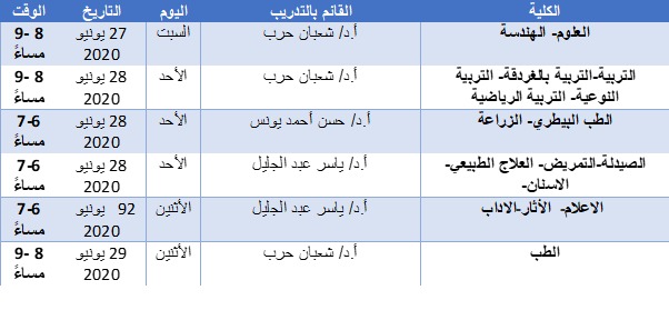 وجدير بالذكر أنه سيقوم بالتدريب نخبة من المدربين المعتمدين من المجلس الأعلى للجامعات من أبناء الجامعة كما هو موضح في الجدول المرفق.