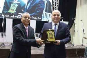 ثم قام رئيس الجامعة ونائب رئيس الجامعة بتكريم الجامعات المشاركة بمنحها شهادات التقدير ودروع الملتقي الفنى كما قامت الجامعات المشاركة بإهداء الدروع لرئيس الجامعة ونواب رئيس الجامعة