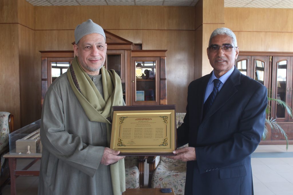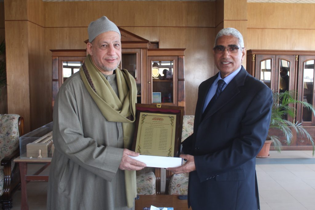 أستقبل اليوم أ.د. رئيس الجامعة بمكتبه أ.د. وأئل محمد الشريف مدير أدارة تدقيق المصاحف بمكة المكرمة ومؤلف ومصنف للعديد من المراجع الكبرى فى التخصصات الدقيقة فى علوم التفسير والقراءات وتوجيها وأعجاز القران فى رسمه وفى العصمة النبوية قام الدكتور وأئل الشريف باهداء رئيس الجامعة درع مكتوب بداخله قصيدة تقدير وثناء على الأستاذ الدكتور عباس محمد محمد منصور رئيس الجامعة وبيان أثره فى تطوير الجامعة وتحديثها ومواكبتها للجامعات العريقة على مستوى الدولة فى الداخل والخارج