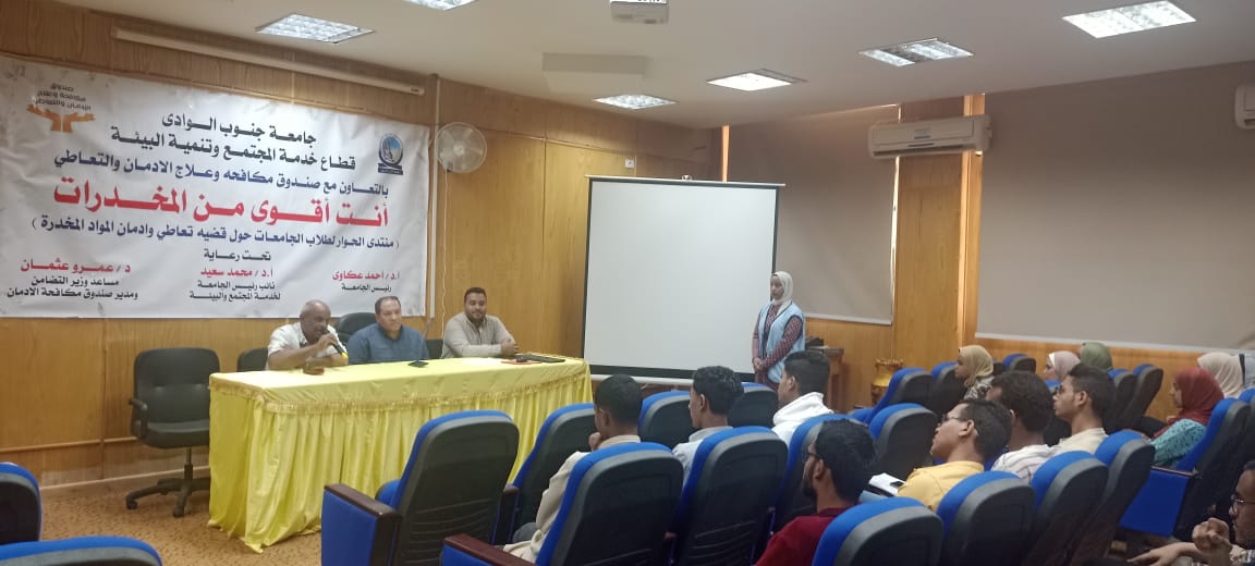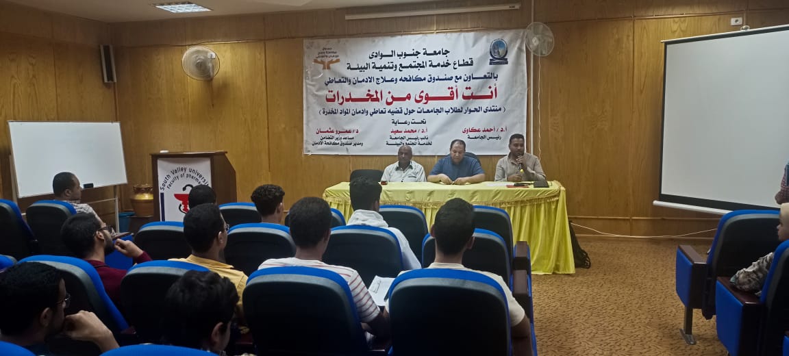فى اطار تفعيل البروتوكول المبرم بين جامعة جنوب الوادي وصندوق مكافحة وعلاج الادمان والتعاطي بشان توعية الطلاب بأضرار المخدرات والتعاطي تحت رعاية الدكتور احمد عكاوي رئيس الجامعة والدكتور محمد سعيد نائب رئيس الجامعة لشئون خدمة المجتمع وتنمية البيئة أقيمت ندوة عن اضرار المخدرات والتعاطي بكلية الصيدلة بحضور الدكتور محمد حسنى وكيل الكلية لشئون خدمة المجتمع وتنمية البيئة، والاستاذ محمود ياسين ممثل صندوق مكافحة وعلاج الادمان والتعاطي ومحمد الكامل مدير أدارة المشروعات البيئية بالجامعة