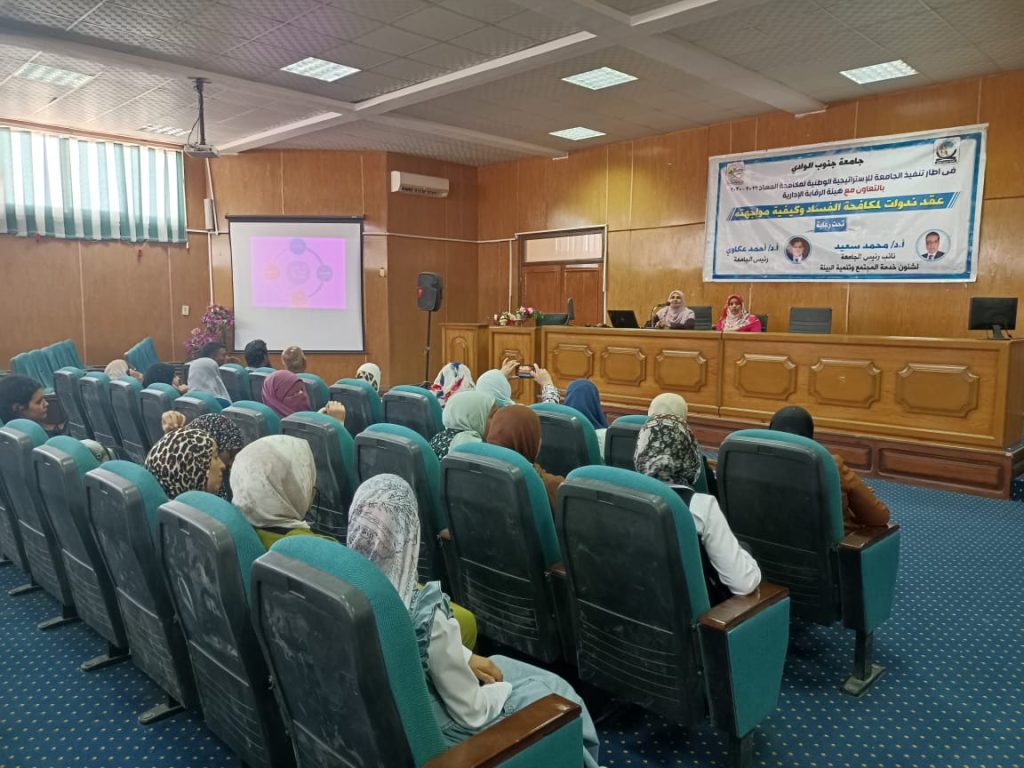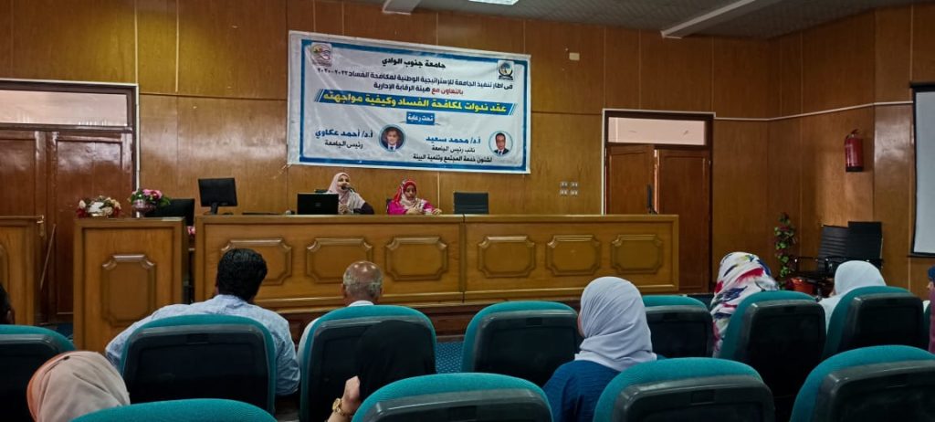 تحت رعاية الدكتور أحمد عكاوي رئيس جامعة جنوب الوادي والدكتور محمد سعيد نائب رئيس الجامعة لشئون خدمة المجتمع وتنمية البيئة نظمت كلية الاعلام بالجامعة ندوة توعوية عن مكافحة الفساد بحضور الدكتورة شيماء عبد العاطي وكيل كلية الإعلام لشئون خدمة المجتمع وتنمية البيئة حاضر فيها الدكتورة عطيات محمود الشاوري الاستاذ بكلية التربية النوعية