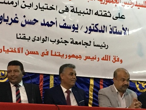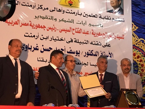 أقامت نقابة المعلمين وأهالى مركز أرمنت، جنوب الأقصر، حفلاً موسعاً بمقر جمعية الشبان المسلمين، لتكريم الدكتور يوسف أحمد غرباوي ابن قرية الزريقات بأرمنت لثقة الرئيس عبد الفتاح السيسي رئيس الجمهورية وتعيينه رئيساً لجامعة جنوب الوادى. حضر الحفل العميد عبدالله عاشور رئيس مركز ومدينة أرمنت واللواء أحمد أبوزيد مساعد وزير الداخلية للأندية الرياضية والمهندس عبدالفتاح خلوصي مدير مصانع سكر أرمنت ولفيف من عمداء الكليات وأعضاء هيئة التدريس بالجامعات المختلفة وعادل الأفيوني أمين عام الجامعة المساعد والحاج سيف الدردير مستشار محافظ قنا وعمد ومشايخ ورجال الدين بالساحة الرضوانية والساحة الجيلانية ورجال الإعلام وقطاعات المجتمع المختلفة وطلاب الجامعات. وفي نهاية الحفل تم تقديم الدروع وشهادات التقدير والهدايا التذكارية للدكتور يوسف غرباوى الذى عبر عن سعادته بهذا التكريم من كل أهالى أرمنت .