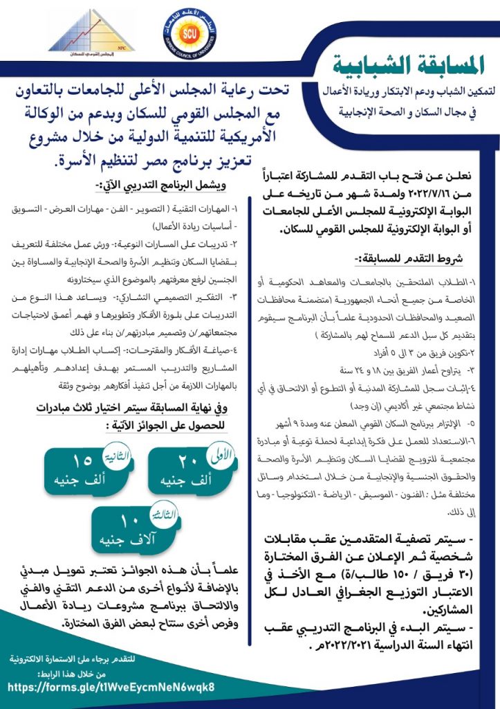 تحت رعاية المجلس الأعلى للجامعات بالتعاون مع المجلس القومي للسكان بدعم من الوكالة الأمريكية للتنمية الدولية من خلال مشروع تعزيز برنامج مصر لتنظيم الأسرة ، تم الاعلان عن فتح باب التقدم للمشاركة اعتبارا من 16/7/2022 ولمدة شهر من تاريخه على البوابة الالكترونية للمجلس الأعلى للجامعات أو البوابة الالكترونية للمجلس القومي للسكان.