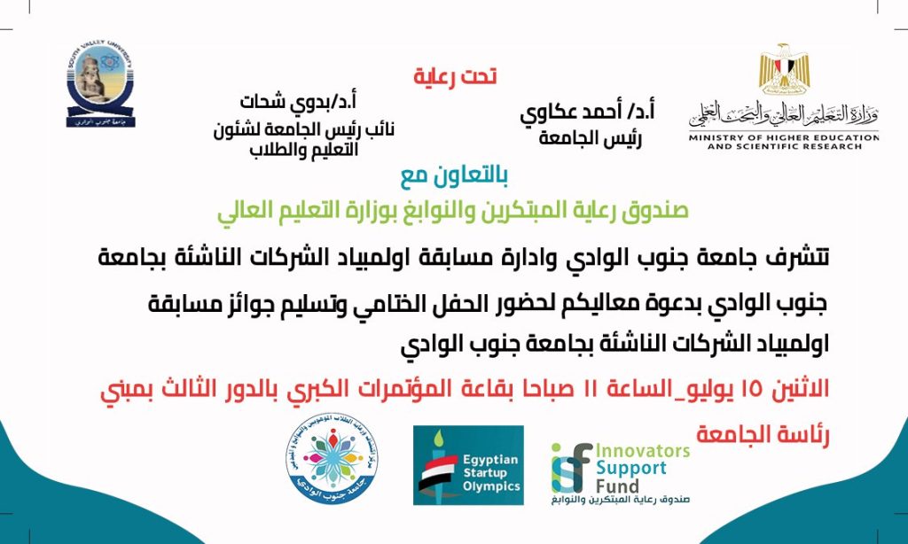 إعلان عن دعوة لحضور الحفل الختامى للأولمبياد جامعة جنوب الوادي للشركات الناشئة
