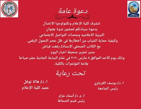 تتشرف كلية الاعلام وتكنولوجيا الاتصال بدعوة سيادتكم لحضور ندوة بعنوان التربية الاعلامية ومنصات التواصل…المزيد