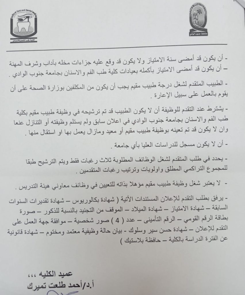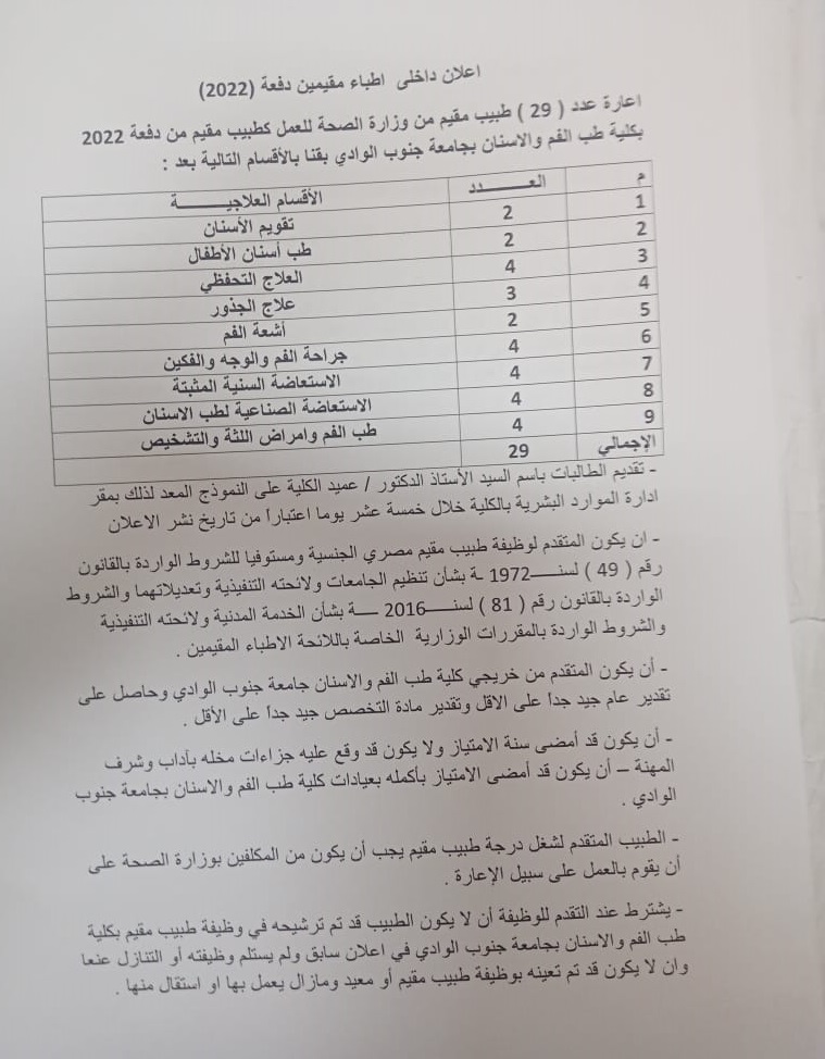 تعلن جامعة جنوب الوادى عن حاجتها لأطباء مقيمين بكلية طب الفم والأسنان بالأقسام التالية :-