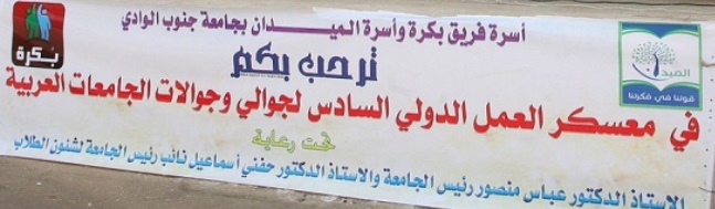 قام أعضاء أسرتى بكرة والميدان بالجامعة بعمل تطوعى حيث قاما بإستقبال وفود الجامعات بالهدايا التذكارية والترحيب وقاما بعمل لافتات ترحيب فى انحاء المعسكر كما قاما بشرح انجازات الجامعة ومعالمها ،وأشاد طلاب الجامعات المشاركة بهذه اللفته الطيبة التى فعلها الطلاب بجهودهم الذاتية وبدون اى توجيهات ويذكر انها المرة الثانية التى تقوم بها اسرة بكرة بعد تكرار التجربة فى البطولة العربية لخماسيات كرة القدم التاسعة ،ومن جانبه قدم الدكتور عباس منصور رئيس الجامعة الشكر لطلاب الأسرتين مؤكدا انهم نموذجا مشرفا للجامعة وخاصة انهم فعلا ذلك بدون أى توجيهات وبجهودهم الذاتيه وقدم الشكر لكافة طلاب الجامعة على حبهم لجامعاتهم والمحافظة عليها مؤكدا ان مكتبه مفتوح لهم فى أى وقت للإستماع لأرائهم ومقترحاتهم للنهوض بجامعتهم .