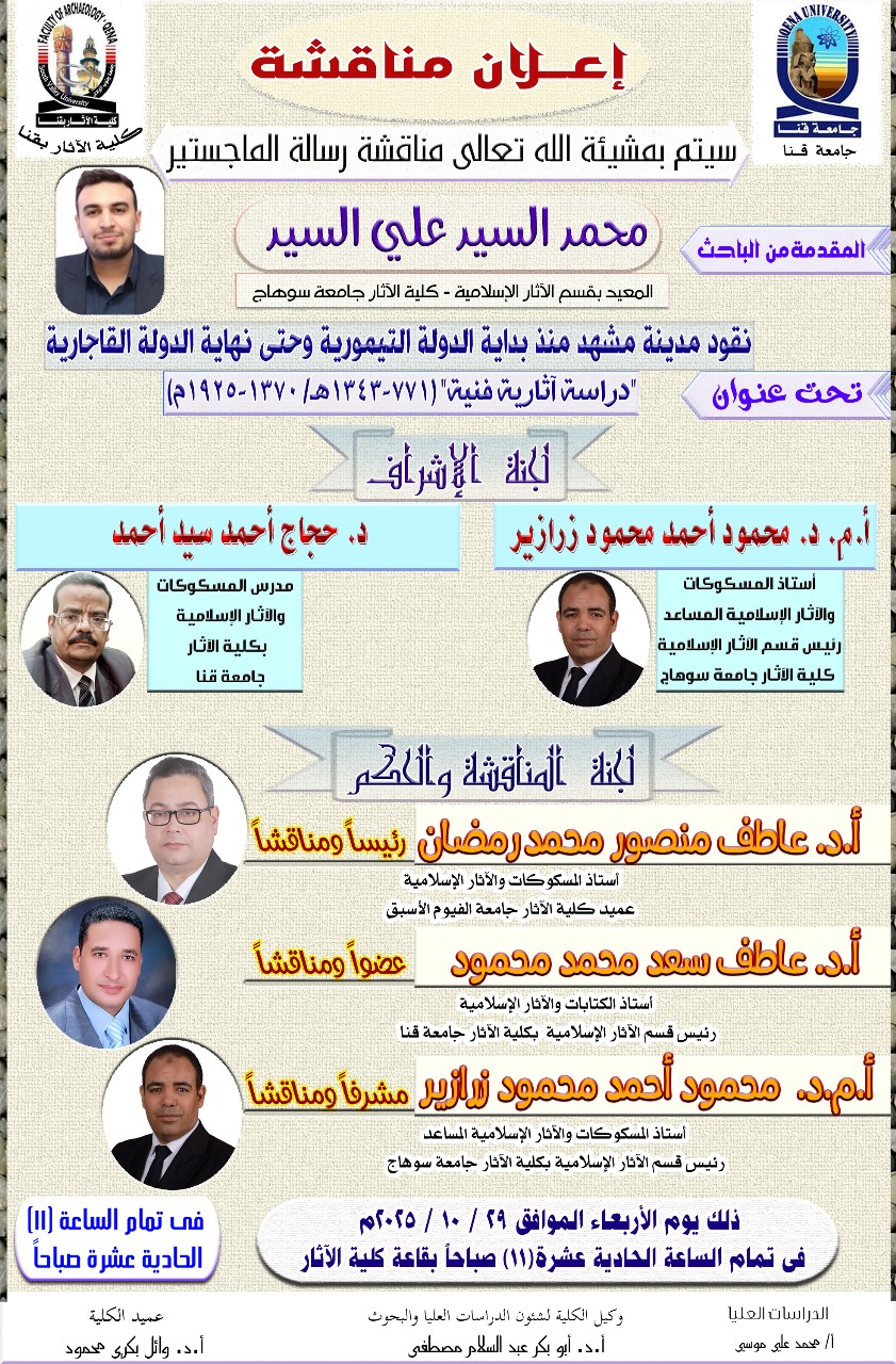 اعلان مناقشة رسالة الماجستير للباحث/ محمد السيد علي السيد