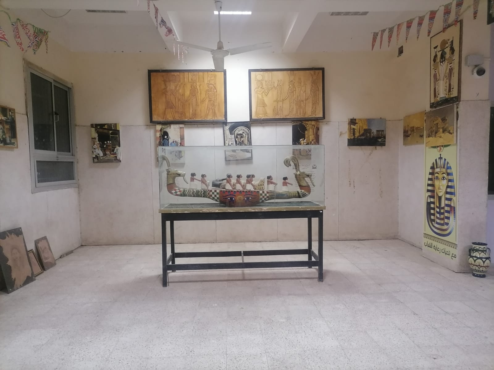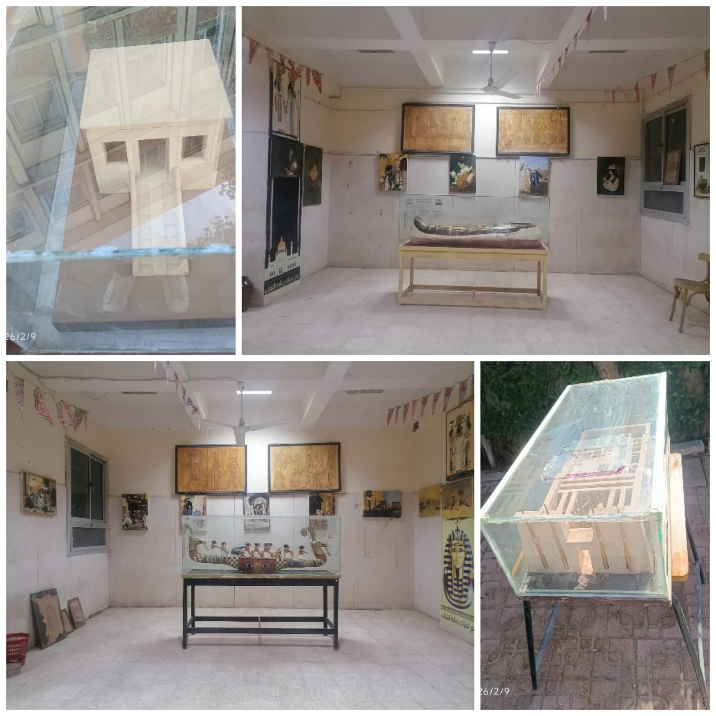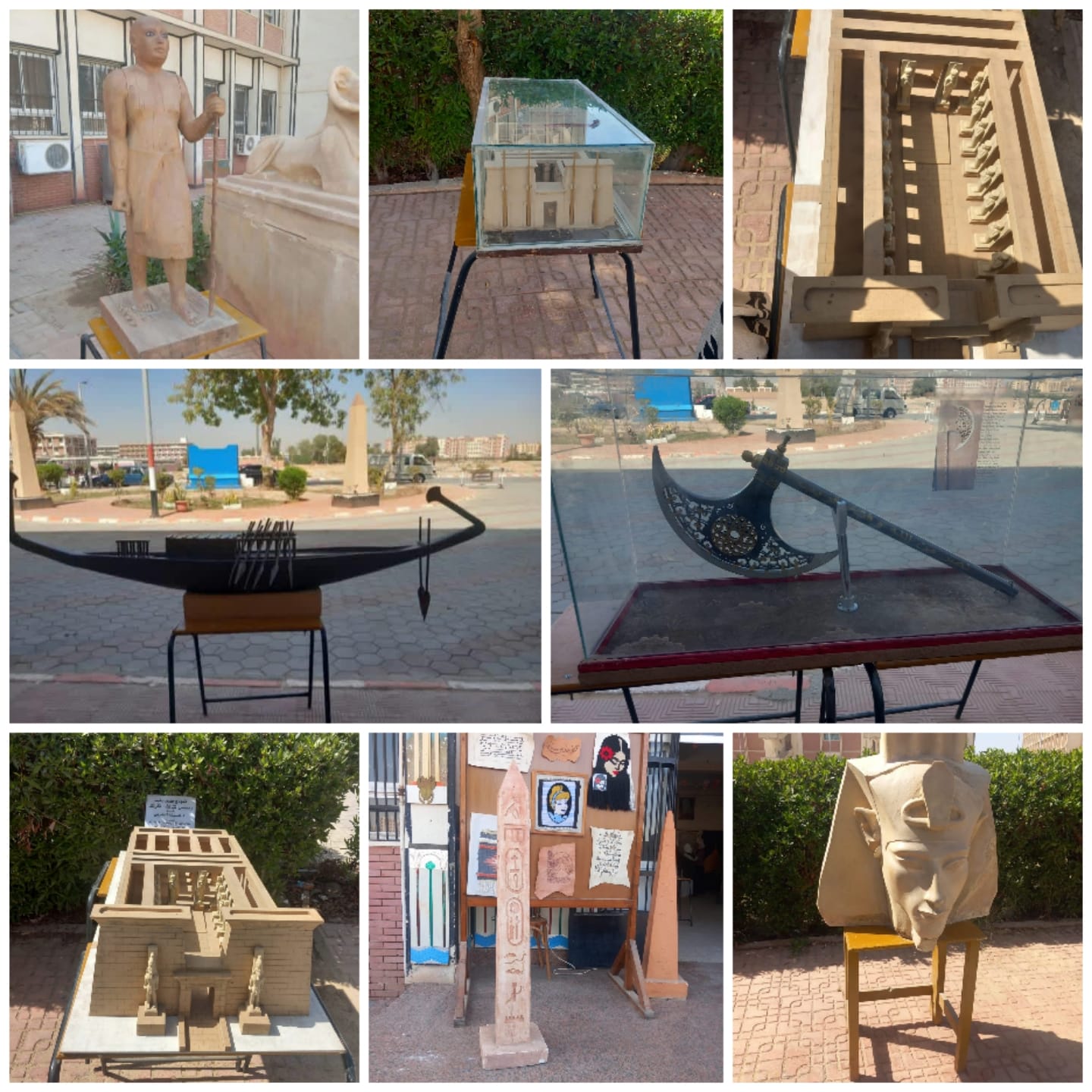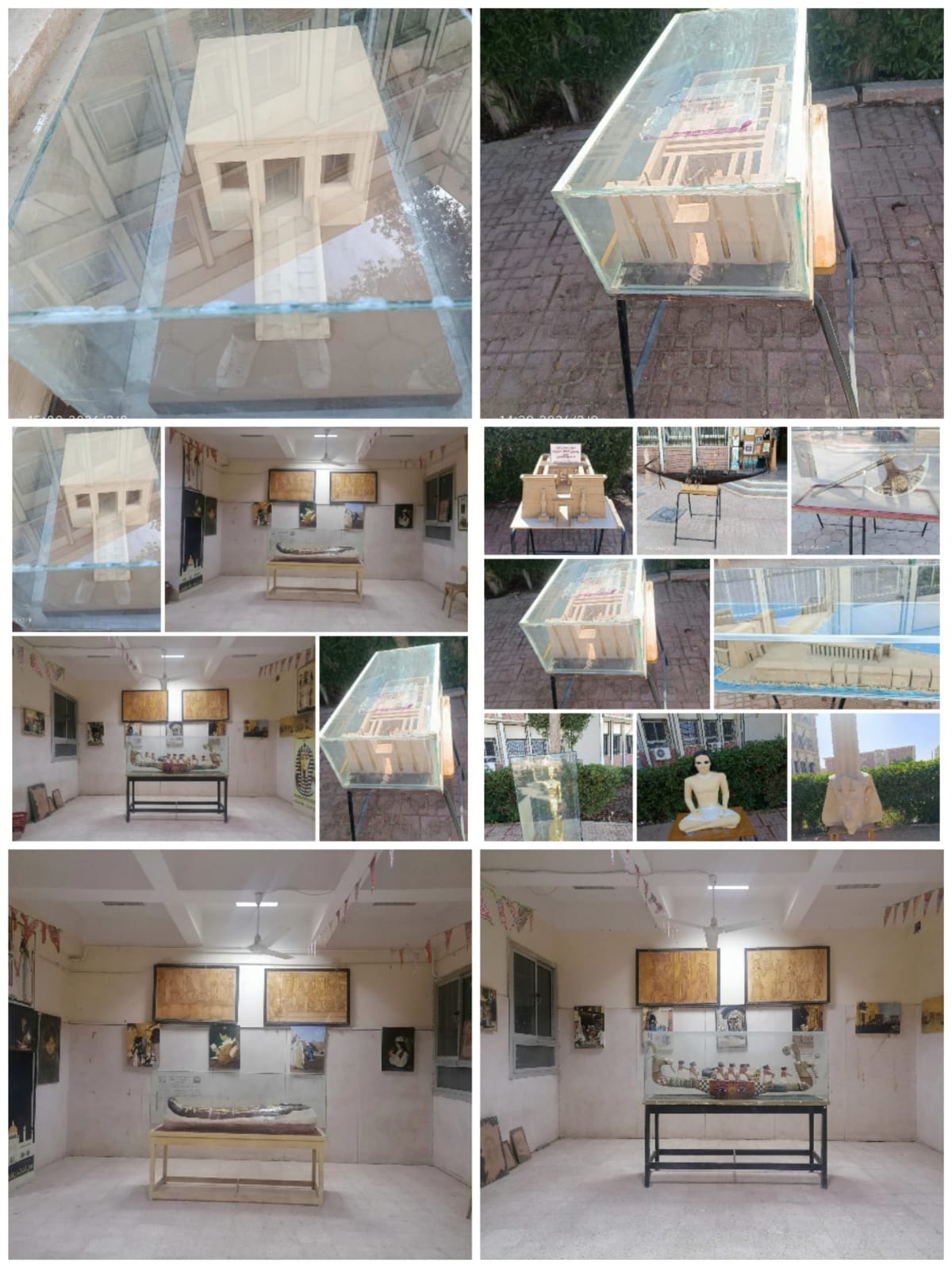 حيث تم عرض صالون فني للوحات الزيتية وكذلك نماذج محاكاة للمعابد المصرية القديمة ونماذج محاكاة لبعض العناصر المعمارية الإسلامية المتمثلة في المأذن وبوابات القاهرة الفاطمية والقصور التاريخية وكذلك تم عرض نماذج لأعمال المنسوجات والمعادن والجلود ومستنسخات جصية التي نفذها طلبة وطالبات قسم ترميم الآثار