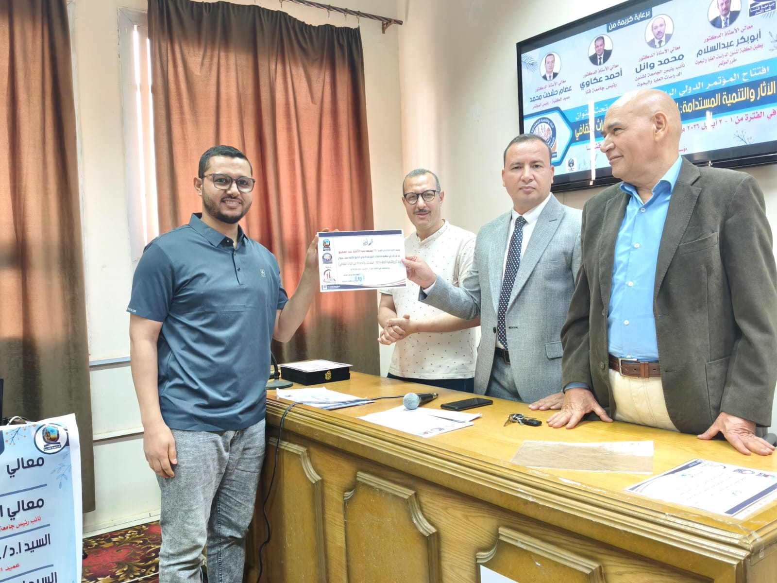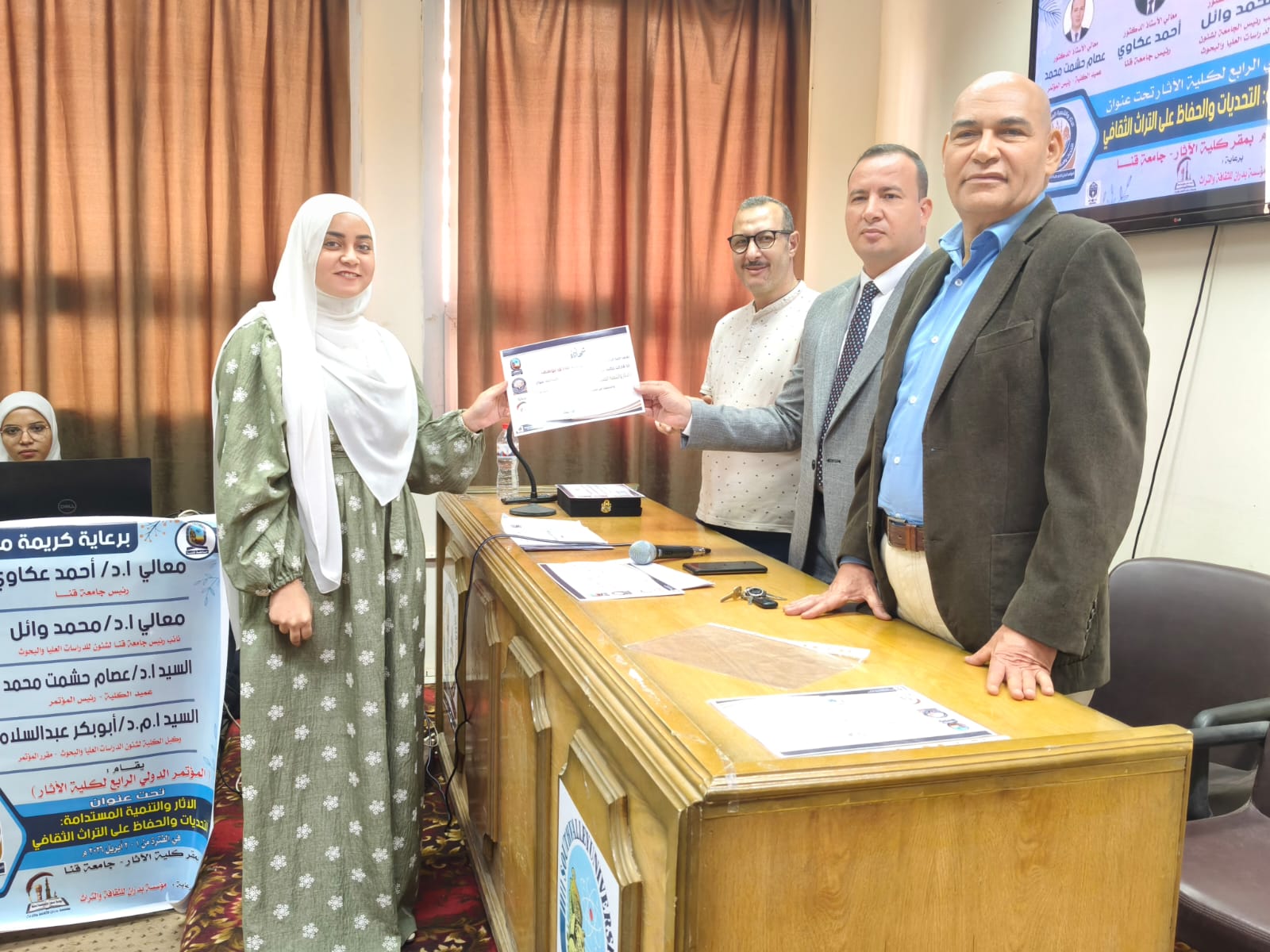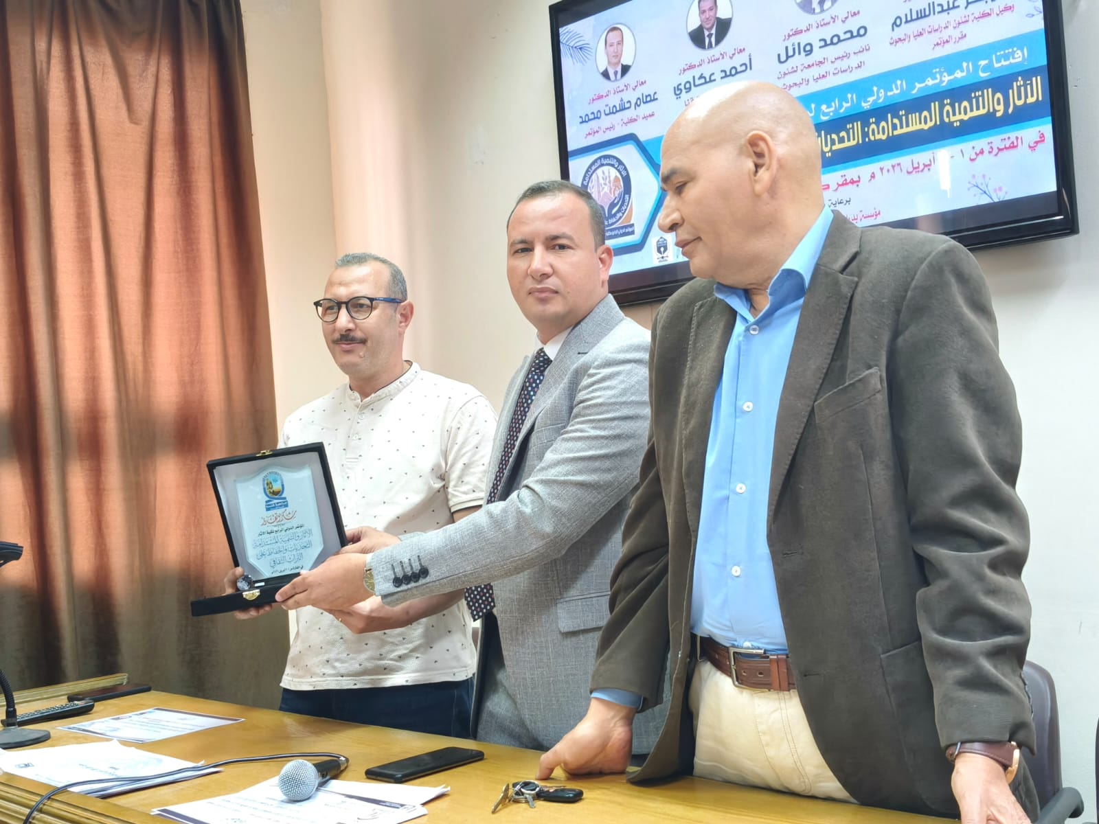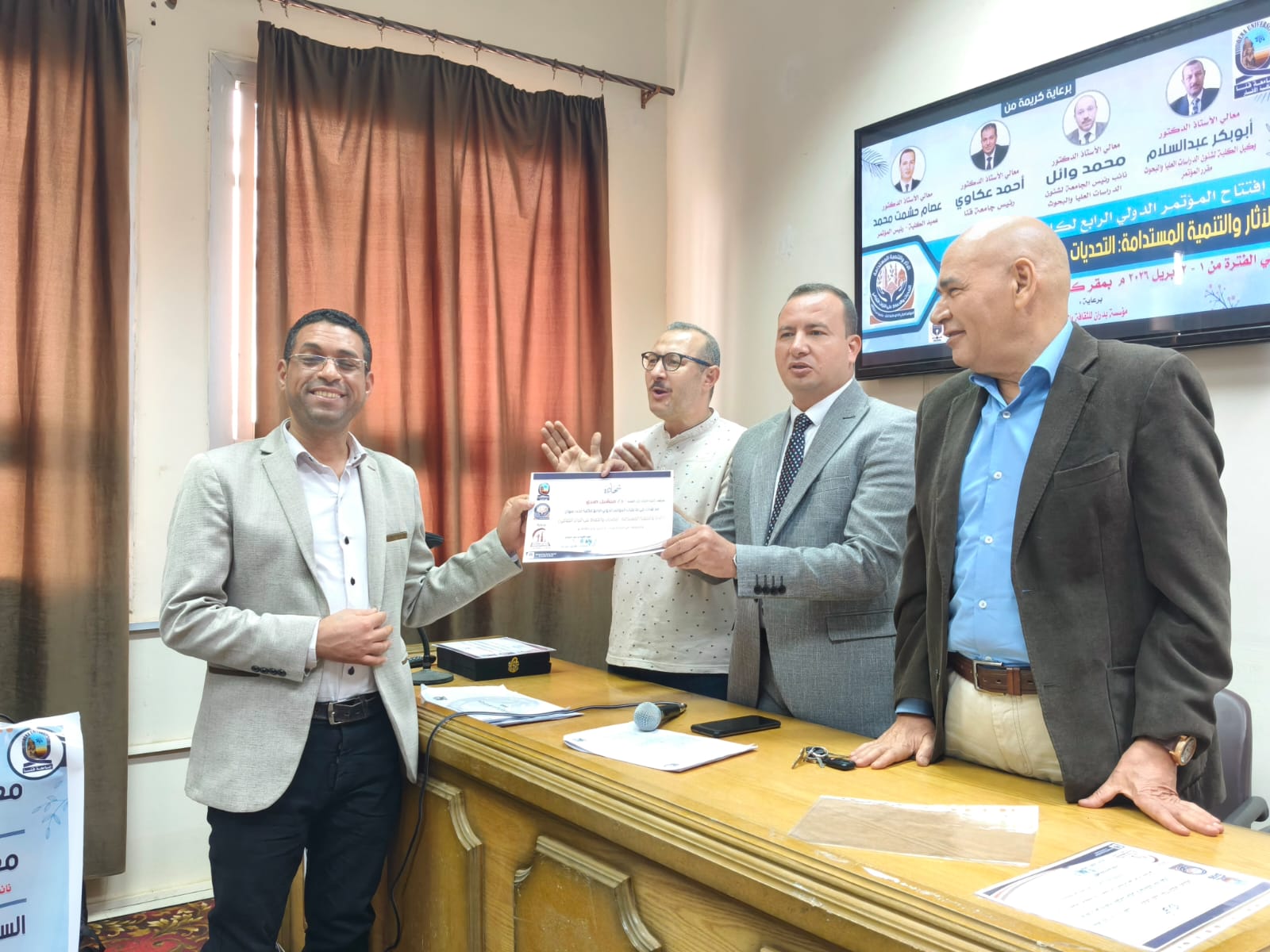 اختتمت يوم الخميس الموافق ٢ أبريل فاعليات الجلسات العلمية للمؤتمر الدولي الرابع لكلية الأثار وفي نهاية المؤتمر تم تكريم أعضاء اللجنة المنظمة ومنح شهادات مشاركة للسادة الباحثين المشاركين في المؤتمر