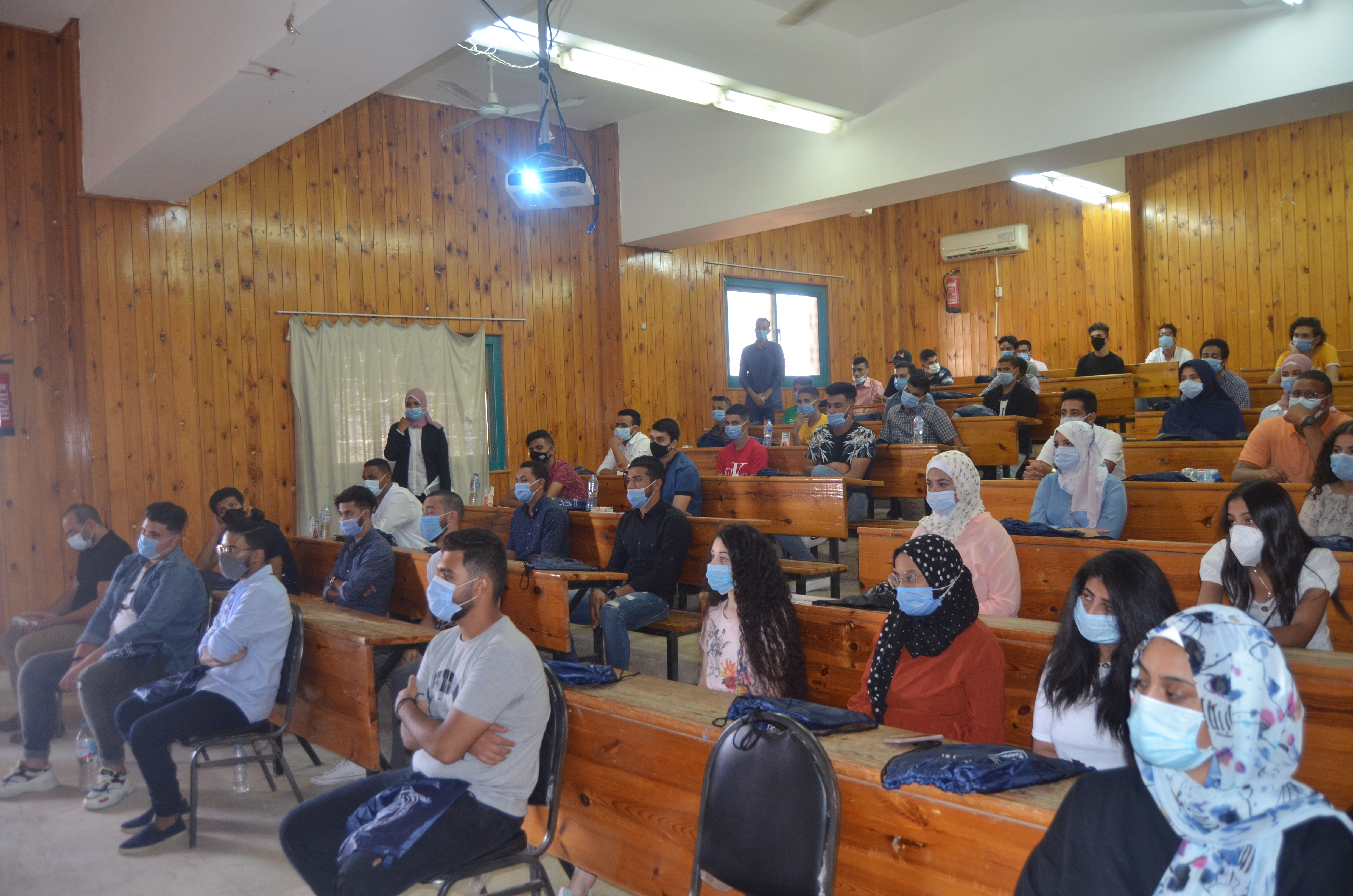 حيث اللقاء التعريفى بدأ بأستقبال الطلاب والطالبات والترحيب بهم فى مدرج المحاضرات بالكلية وتم التأكيد عليهم بأتباع الاجراءات الاحترازيه خلال الدراسه هذا العام ثم تم عرض شرح تفصيلى عبر الفيديو كونفرس من عمداء كليات الحاسبات وادارة الاعمال لطبيعة الدراسه وكيفية التعامل عبر منصات التعلم الالكترونى .